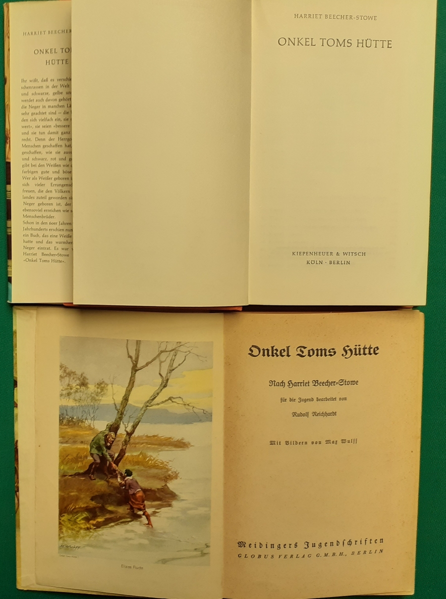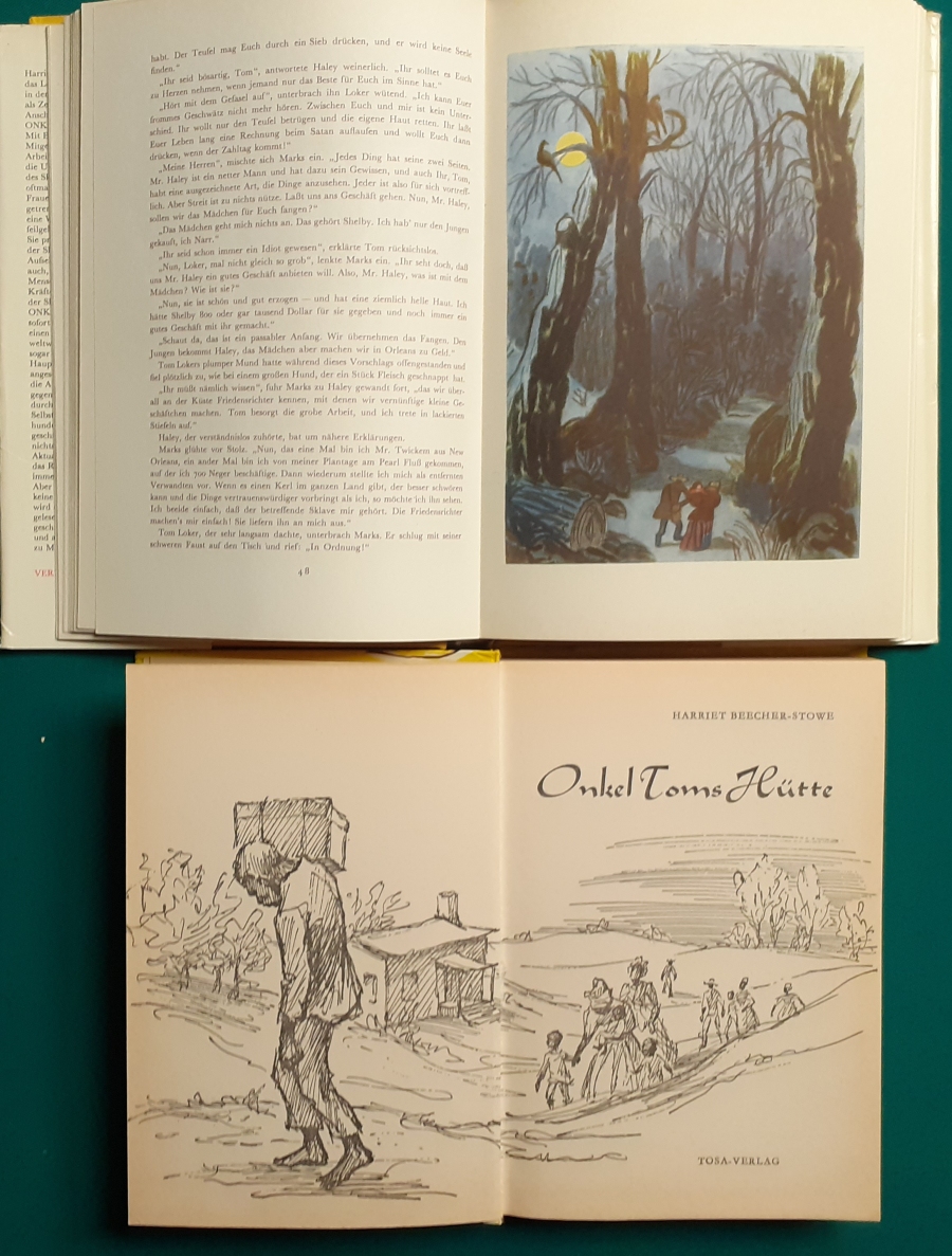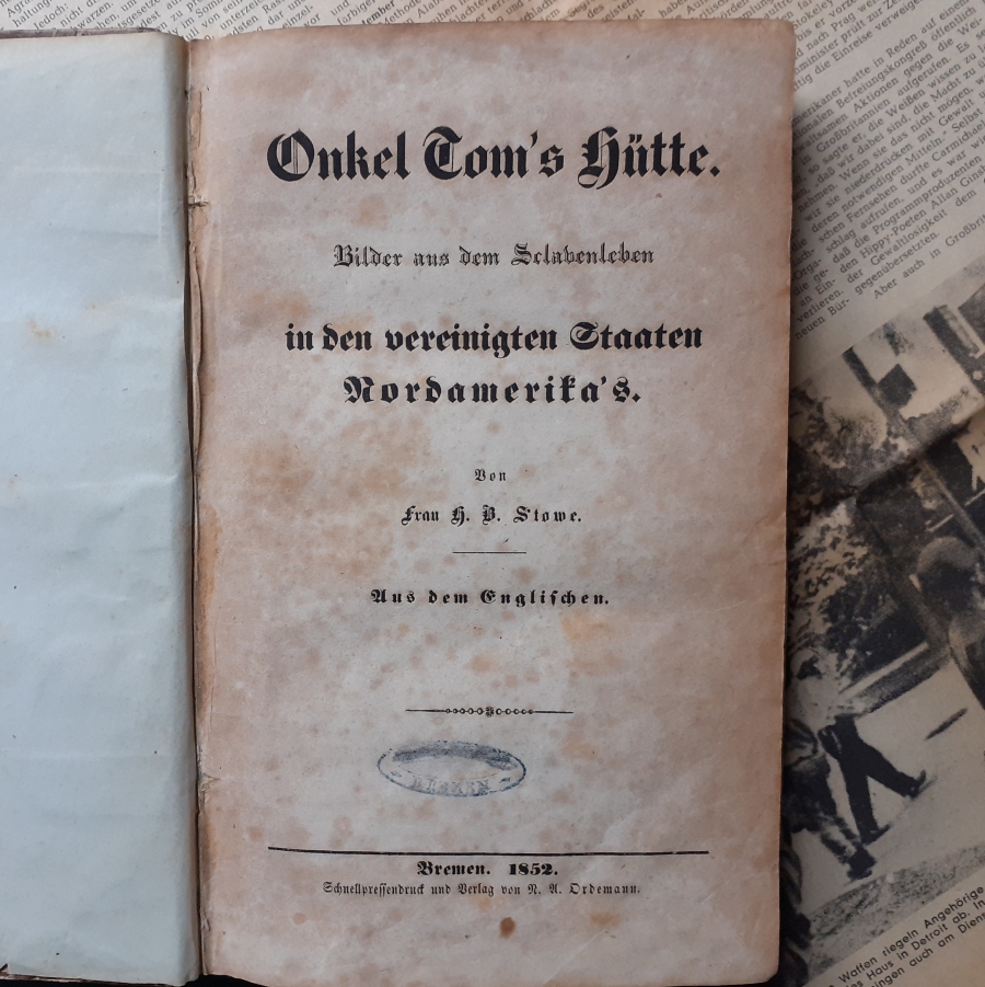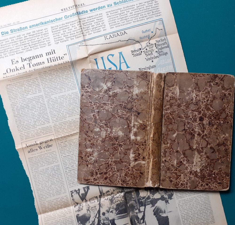 Onkel Tom`s Hütte Ordemann Verlag, vermutlich Deutsche Erstausgabe von 1852!!!, 280 Seiten, offensichtlich restauriertes Buch mit "neuer" Bindung (ca. 1930) und sehr festem Hartpappeinband; innen ziemlich gelbfleckig; aber alles gut lesbar und alle Seiten fest; befriedigender altersgemäßer Zustand Preis: 25 EURO Zubehör: Im Buch liegt ein Zeitungsausschnitt vom 26.07.1967 der Bremer Nachrichten mit drei Artikeln über die Rassenunruhen in den USA; darunter einer Chronik der 1967 plötzlich ausgebrochenen Rassenkämpfe in den USA; ein weiterer Artikel befaßt sich mit Rassenunruhen in England. |