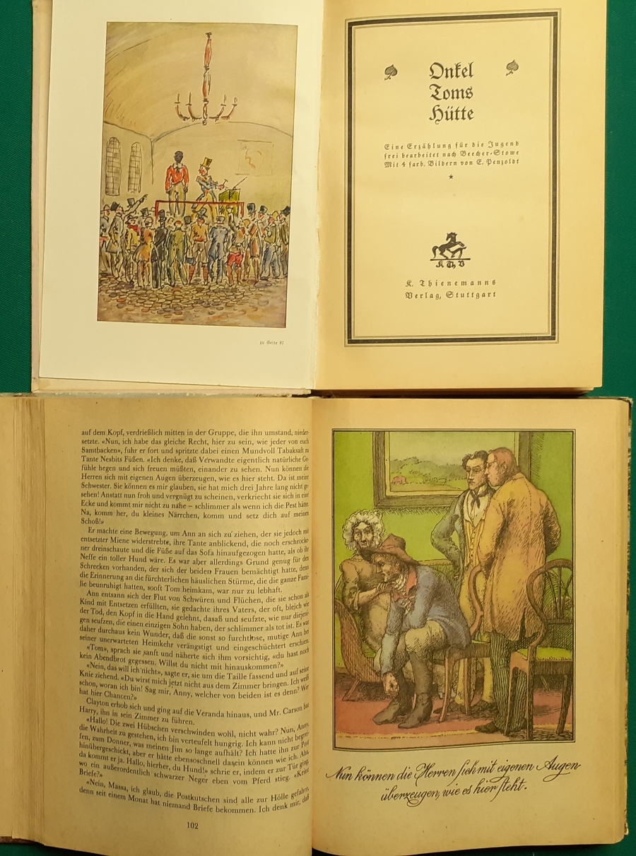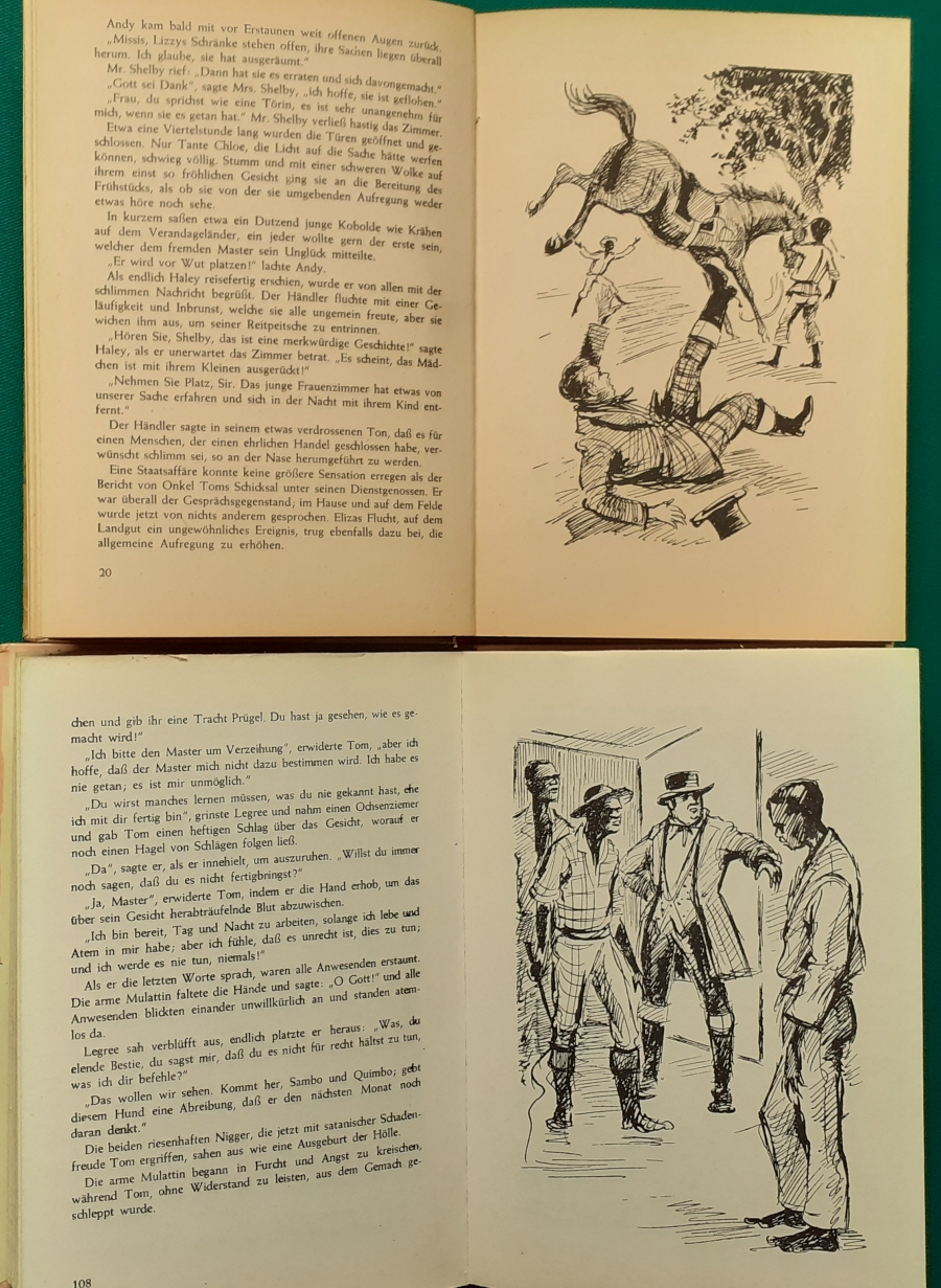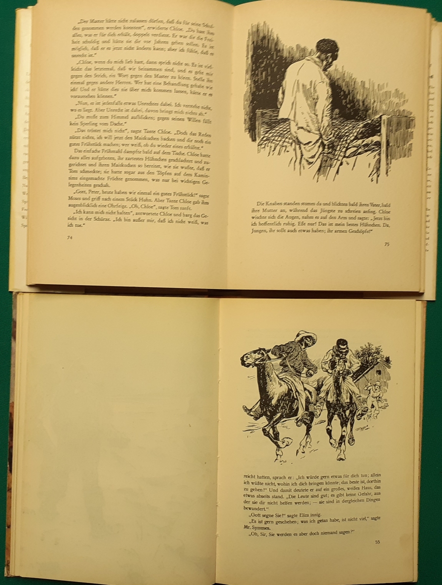 Onkel Tom`s Hütte Ordemann Verlag, vermutlich Deutsche Erstausgabe von 1852!!!, 280 Seiten, offensichtlich restauriertes Buch mit "neuer" Bindung (ca. 1930) und sehr festem Hartpappeinband; innen ziemlich gelbfleckig; aber alles gut lesbar und alle Seiten fest; befriedigender altersgemäßer Zustand Preis: 25 EURO Zubehör: Im Buch liegt ein Zeitungsausschnitt vom 26.07.1967 der Bremer Nachrichten mit drei Artikeln über die Rassenunruhen in den USA; darunter einer Chronik der 1967 plötzlich ausgebrochenen Rassenkämpfe in den USA; ein weiterer Artikel befaßt sich mit Rassenunruhen in England. |