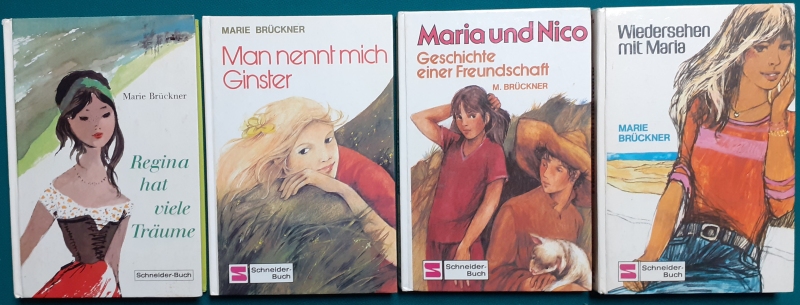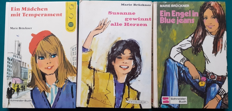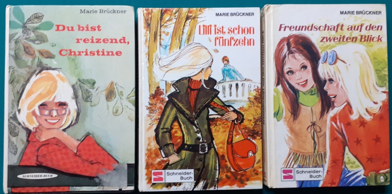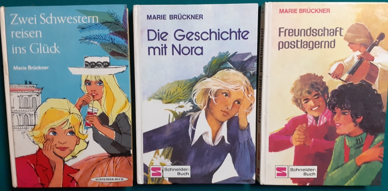 Rundum lackierte Schneiderbücher aus den 1960er/70er Jahren vonMarie Brückner: Zwei Schwestern reisen ins Glück Die Geschichte mit Nora Freundschaft postlagernd |