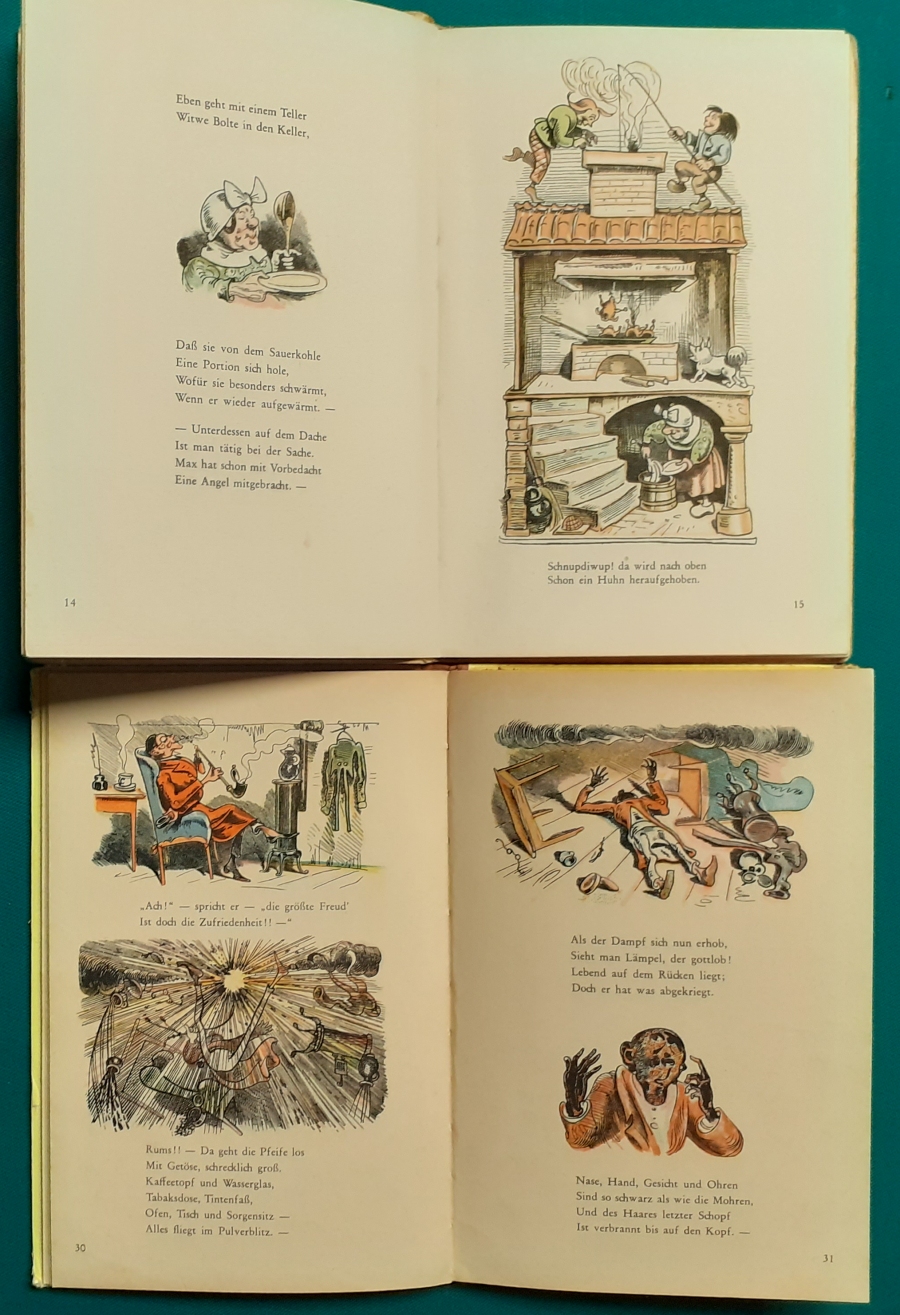 von Max und Moritz Ausgabe etwa um 1952; Pestalozzi-Bilderbuch Nr. 4085 mit Leinenband am Rücken und mit abwaschbarem Hochglanzeinband, Seiten aus relativ festem Papier durchgehend farbig illustriert; Format des Buches 23,5 x 17 cm, Gebrauchsspuren vom Umblättern; an den Buchkanten bestoßen, Buchblock vorn am Gelenk etwas gelockert und mit Tesafilm am Vorsatz vorn innen schonend stabilisiert - Bindung ok., Buchschnitt unsauber; insgesamt noch in befriedigendem altersgemäßen Zustand Preis 5 EURO |