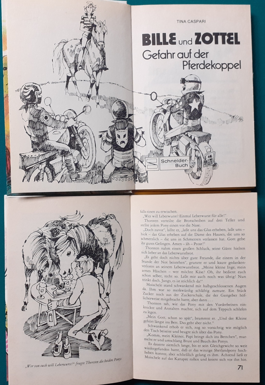 Rundum lackierte Hardcover-Ausgabe Tina Caspari: Sommer, Sonne und zwei Pferde Ausgabe von 1981, Illustrationen von Renate Vögel-Cossmann, 186 Seiten in sehr großen Druckbuchstaben für Leseanfänger, guter altersgemäßer Zustand Zum Inhalt: Preis: 5 EURO |