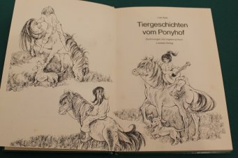 Lise Gast: Tiergeschichten vom Ponyhof Loewes Verlag, Bayreuth, Erstausgabe von 1976, Illustrationen von Ingeborg Haun, 94 Seiten, rundum lackierter fester Hartpappeinband, an den Buchkanten nur leicht bestoßen; altersgemäßer sehr guter Zustand Preis: 6 EUR Hier zur Illustratorengalerie mit typischen Arbeiten von Ingeborg Haun |