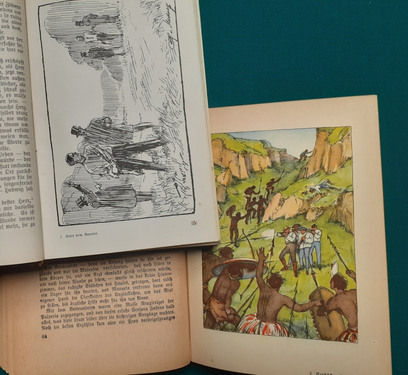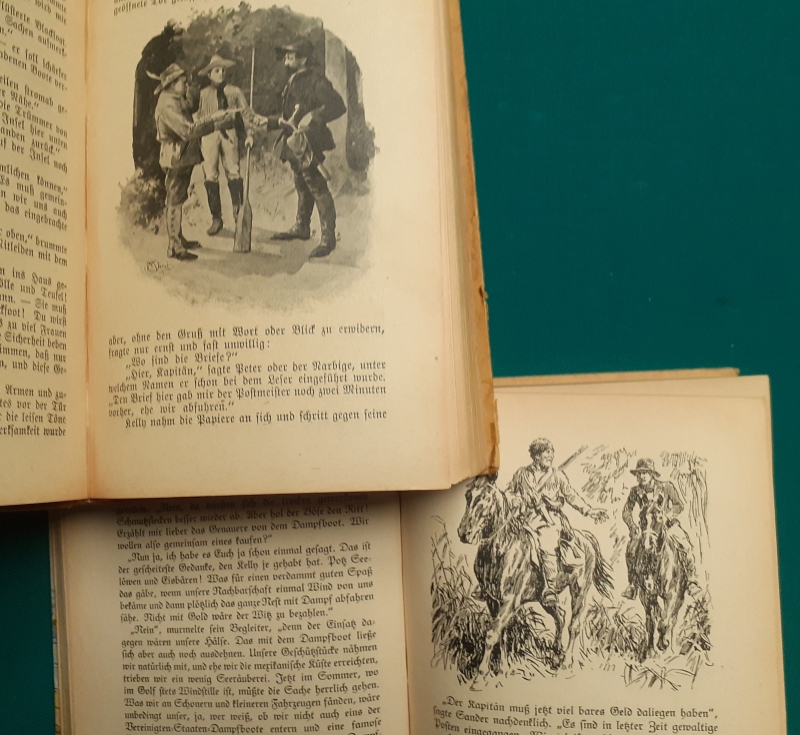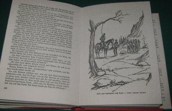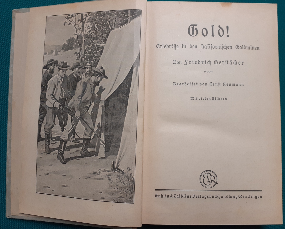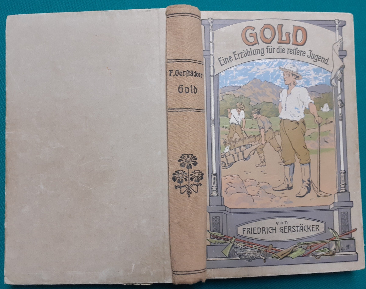 Friedrich Gerstäcker: Gold Ausgabe von 1924, viele sehr schöne Illustrationen von "G. St." ??, Ensslin Verlag, Reutlingen; Leinenrücken mit festem Hartpappeinband im Format 20 x 13 cm; 536 Seiten; sehr dekorativer Einband und insgesamt gepflegter altersgemäßer Zustand, Preis: 12 EUR |