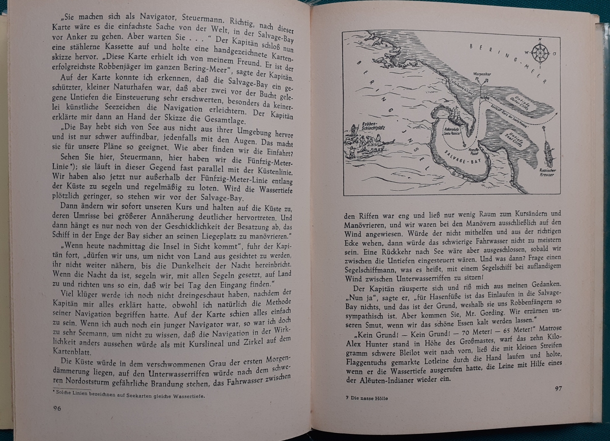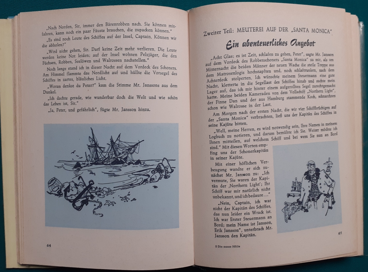 Die Seefahrts-Abenteuer-Reihe: Jugendbuchreihe der Göttinger Jugendbände (GJB) im Fischer Verlag; Der Sammelband: Die nasse Hölle enthält die Einzelbände: Ausgabe von 1959, Illustrationen von Kurt Schmischke; 200 Seiten, Leinenrücken mit lackiertem festen Hartpappeinband; mit dem seltenen Cellophan-Schutzumschlag; an den Buchkanten etwas bestoßen, insgesamt guter altersgemäßer Zustand, Preis: 13 EUR Hier zur Illustratoren-Galerie mit typischen Arbeiten von Kurt Schmischke |
