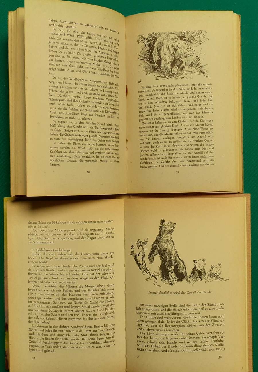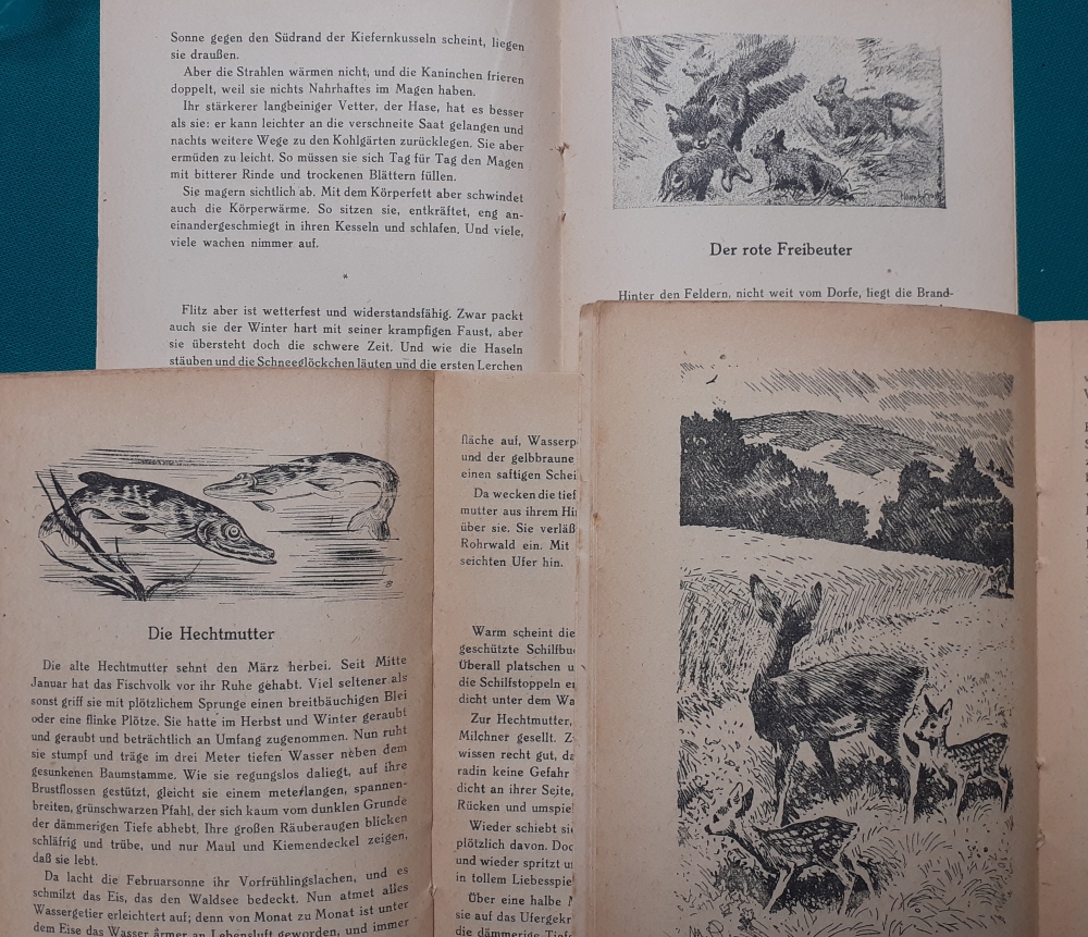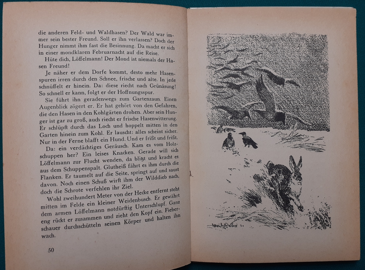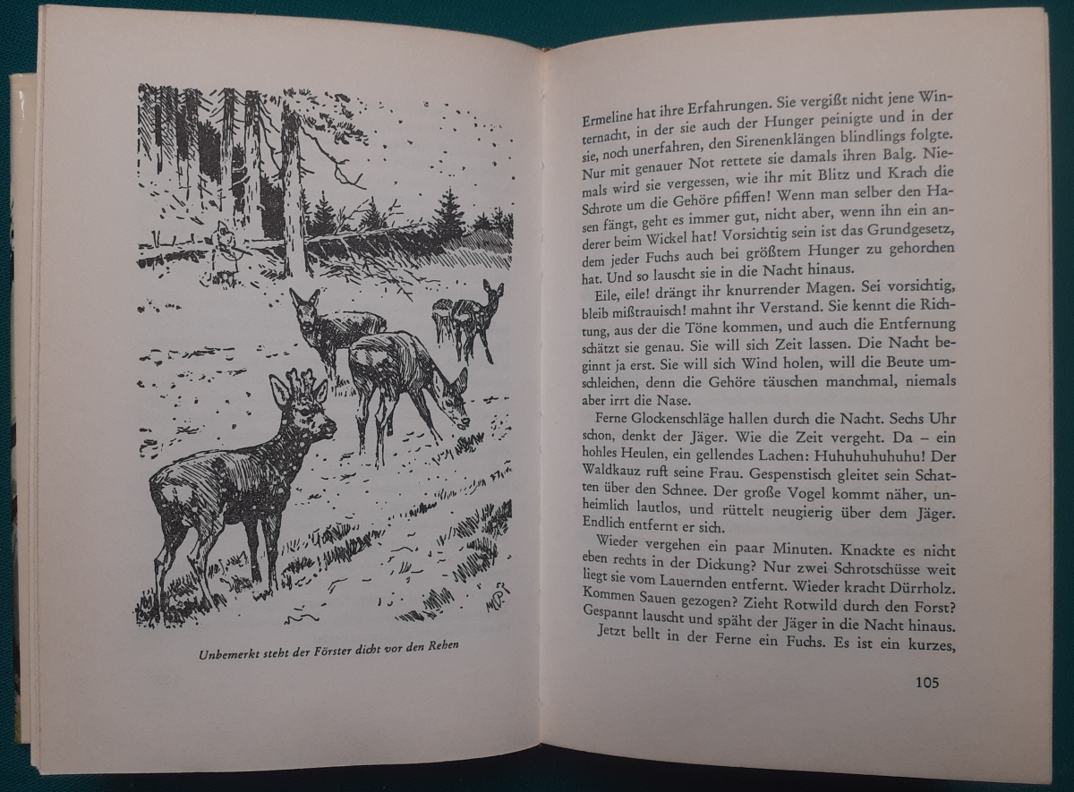 aus dem Erich Kloss: Förster Specht und seine Füchse Illustrationen von Adalbert Meckel, Ausgabe von 1950, 80 Seiten, Leinenrücken mit festem lackierten Hartpappeinband; etwas an den Buchkanten bestoßen; recht guter altersgemäßer Zustand Preis: 8 EURO |
