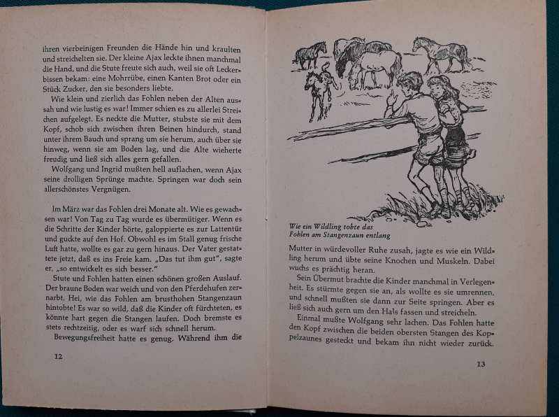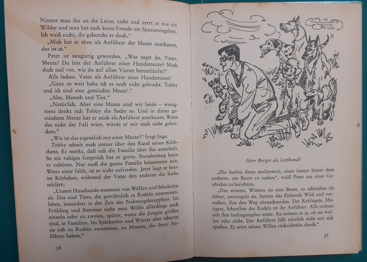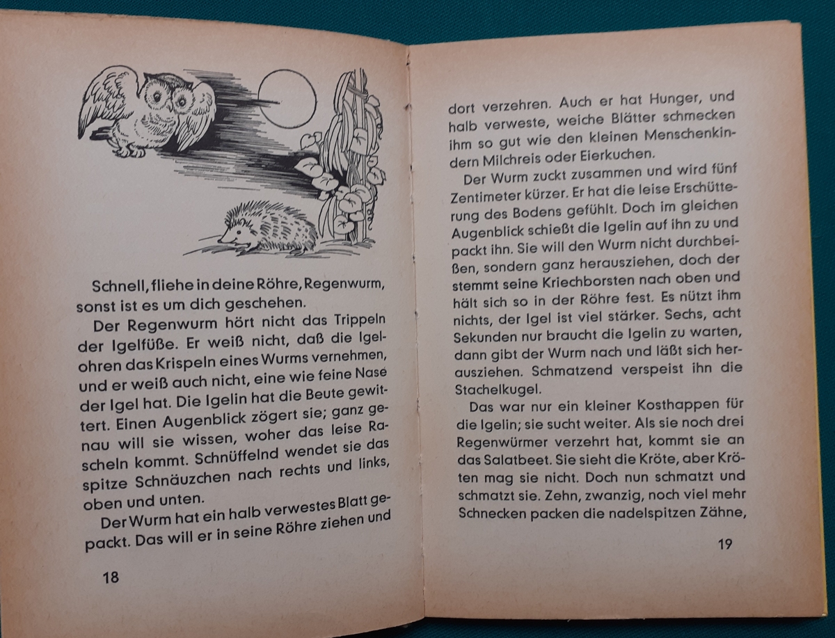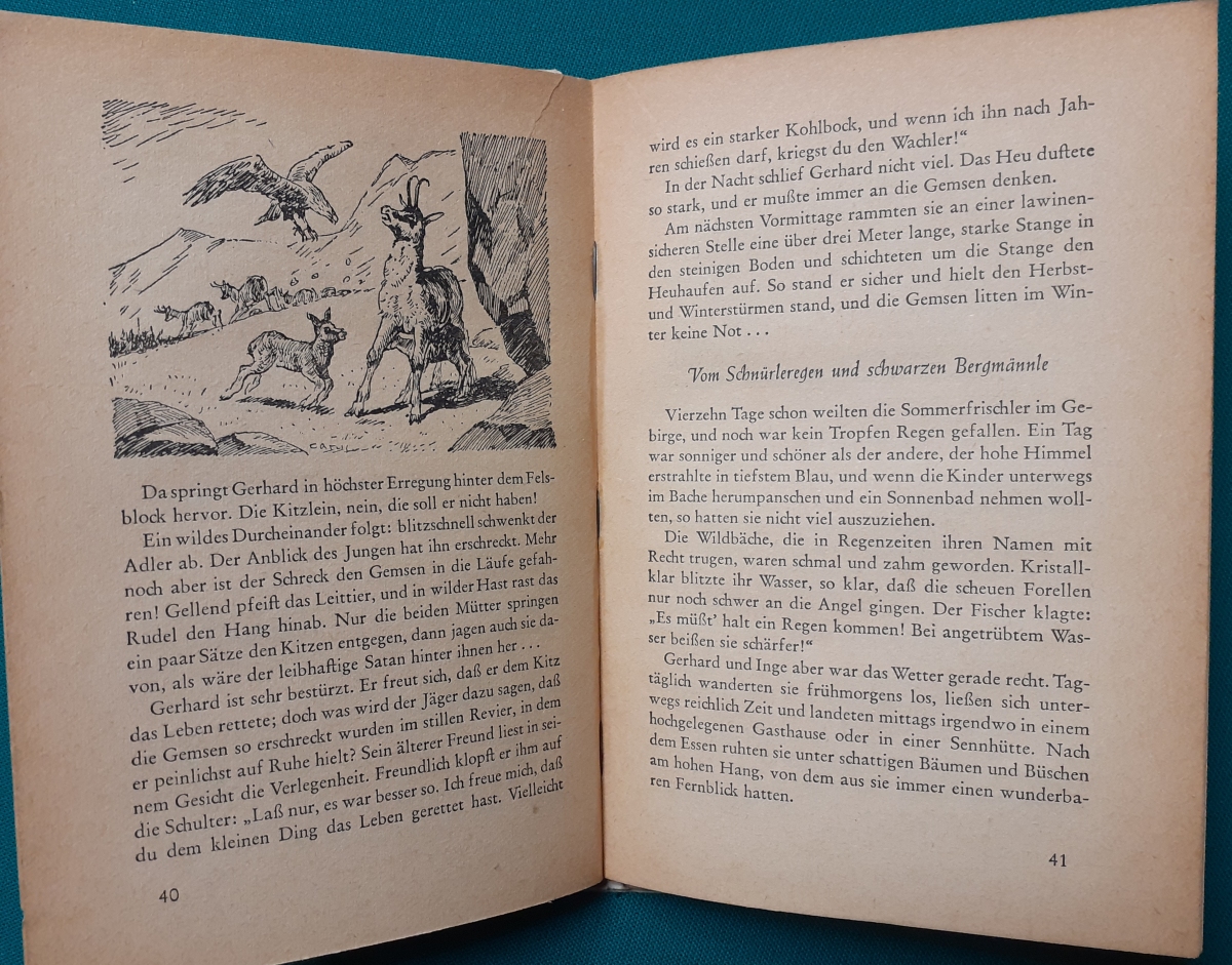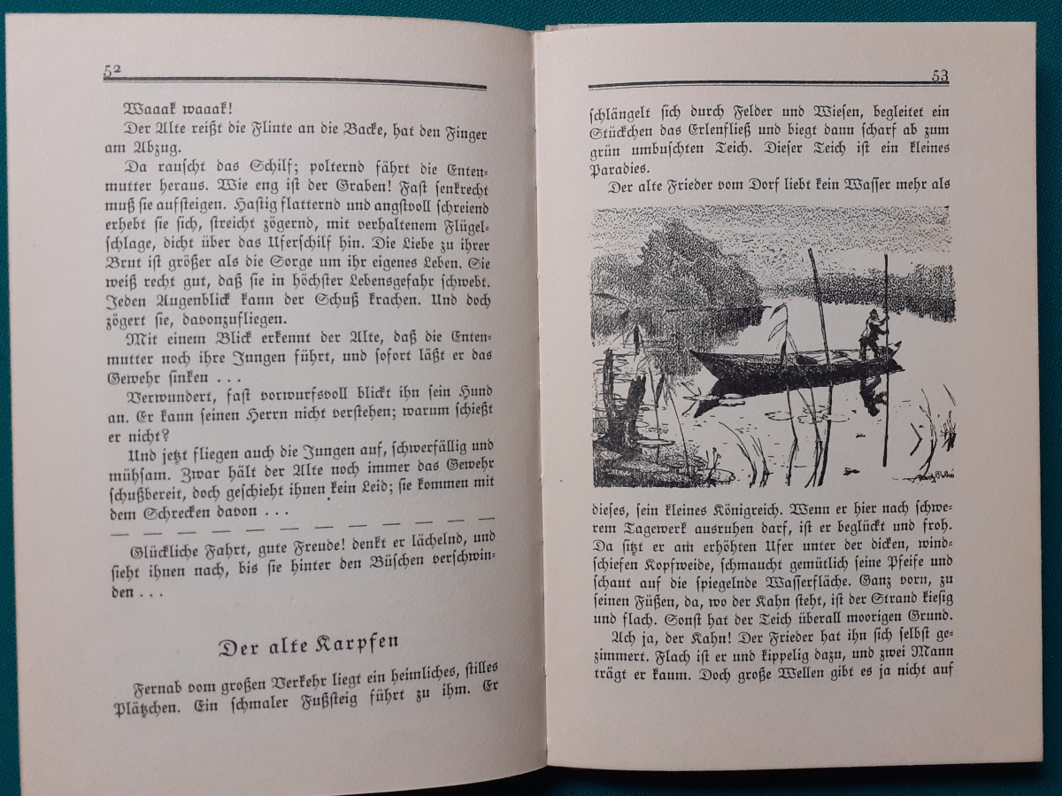 aus dem Erich Kloss: Förster Specht und seine Füchse Illustrationen von Adalbert Meckel, Ausgabe von 1950, 80 Seiten, Leinenrücken mit festem lackierten Hartpappeinband; etwas an den Buchkanten bestoßen; recht guter altersgemäßer Zustand Preis: 8 EURO |