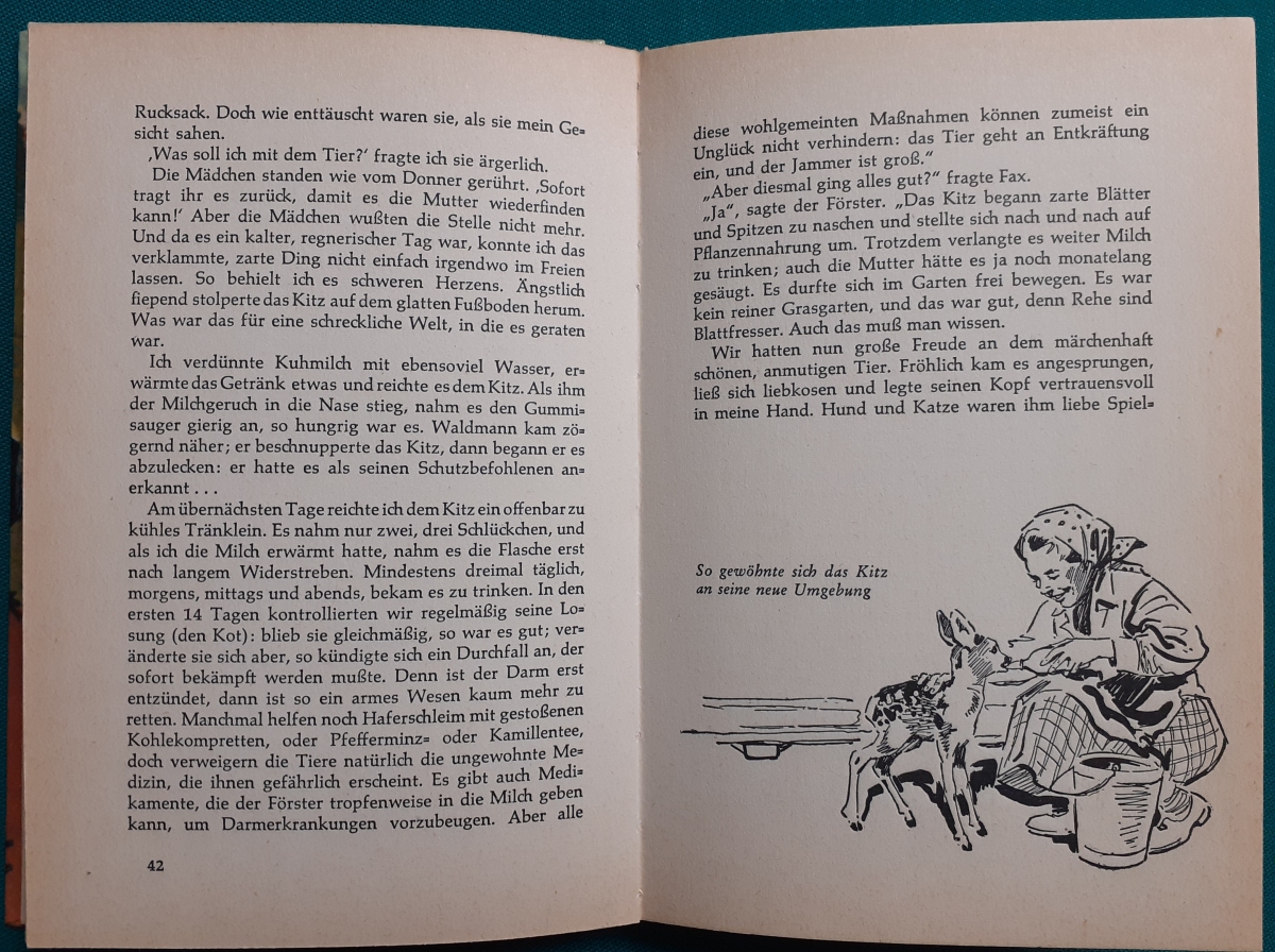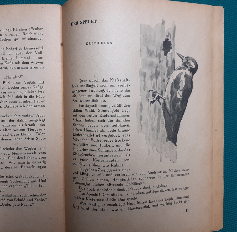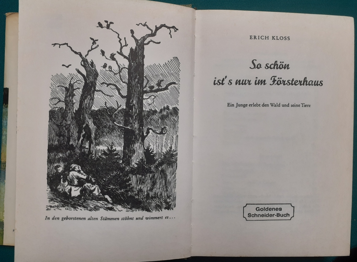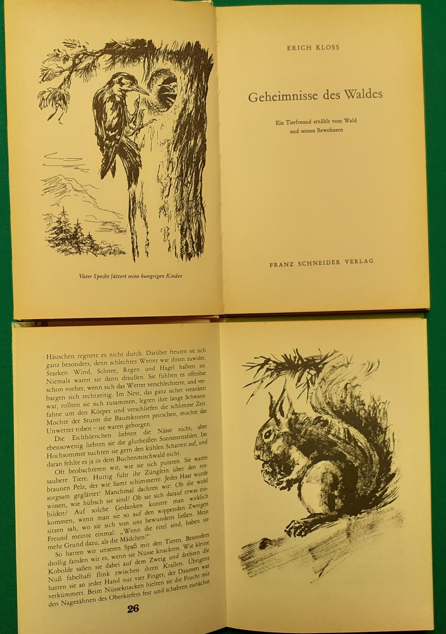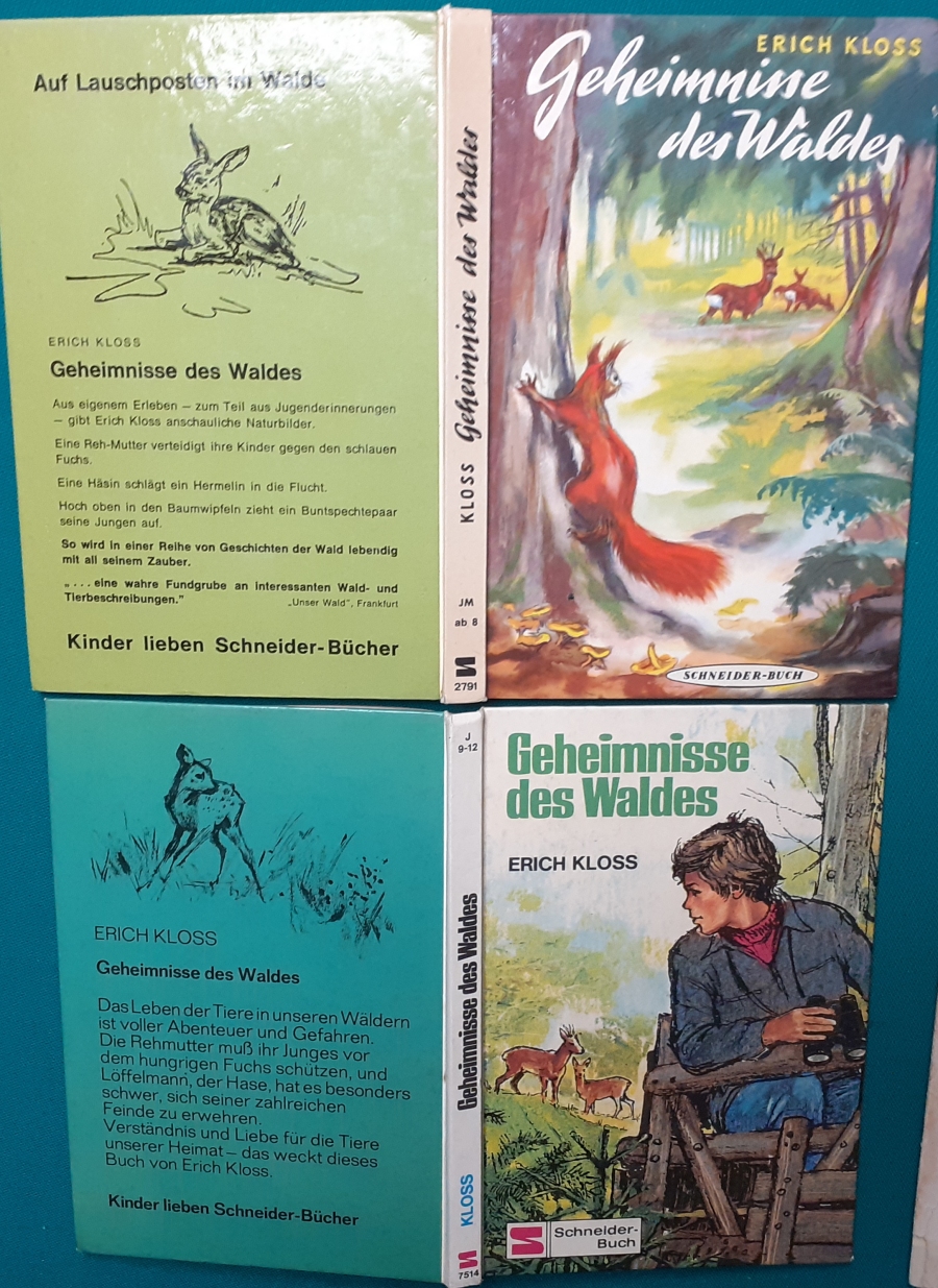 Die Version des obigen Buches aus den 1950er Jahren: Erich Kloss: Geheimnisse des WaldesEin Tierfreund erzählt vom Wald und seinen Bewohnern Illustrationen von Moritz Pathé, Ausgabe um 1953; guter altersgemäßer Zustand Zum Inhalt: Diese veränderte Version enthält 6 Geschichten: Eine Rehmutter und ihr Kind - Löffelmann - Flitz - Der rote Freibeuter - Eichhörnchen - Buntspechte Preis: 7 EUR |