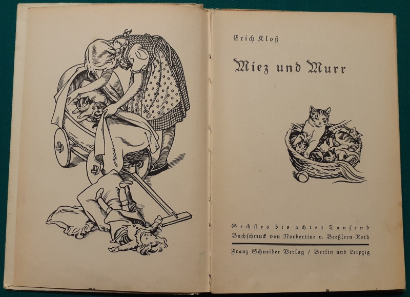 Originalausgabe um 1940 aus dem Erich Kloss: Miez und Murr Wunderschöne Illustrationen von Norbertine von Breßlern-Roth, Ausgabe um 1940, 64 Seiten, Leinenrücken mit festem Hartpappeinband; Buchblock im Gelenk etwas gelockert; Aber Bindung ok. und alle Blätter halten fest; etwas an den Buchkanten bestoßen; noch recht guter altersgemäßer Zustand Preis: 8 EURO Hier zur Illustratoren-Galerie mit typischen Arbeiten von Norbertine von Bresslern-Roth |