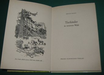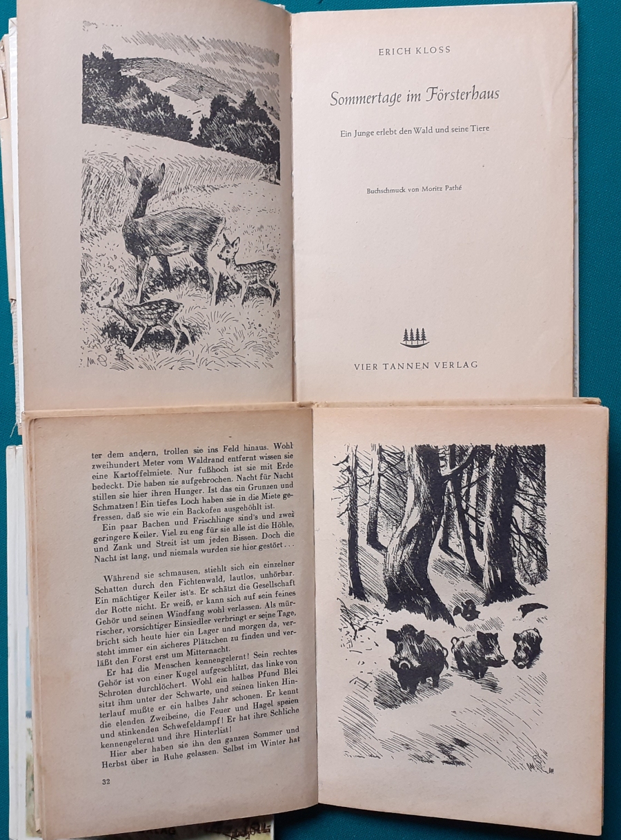 1950er / 1960er Jahren Erich Kloss: Tierkinder in unserem Wald Illustrationen von Moritz Pathé, Ausgabe um 1960; 114 Seiten; Rücken oben etwas beschädigt und mit Tesafilm schonend repariert; sonst guter altersgemäßer Zustand