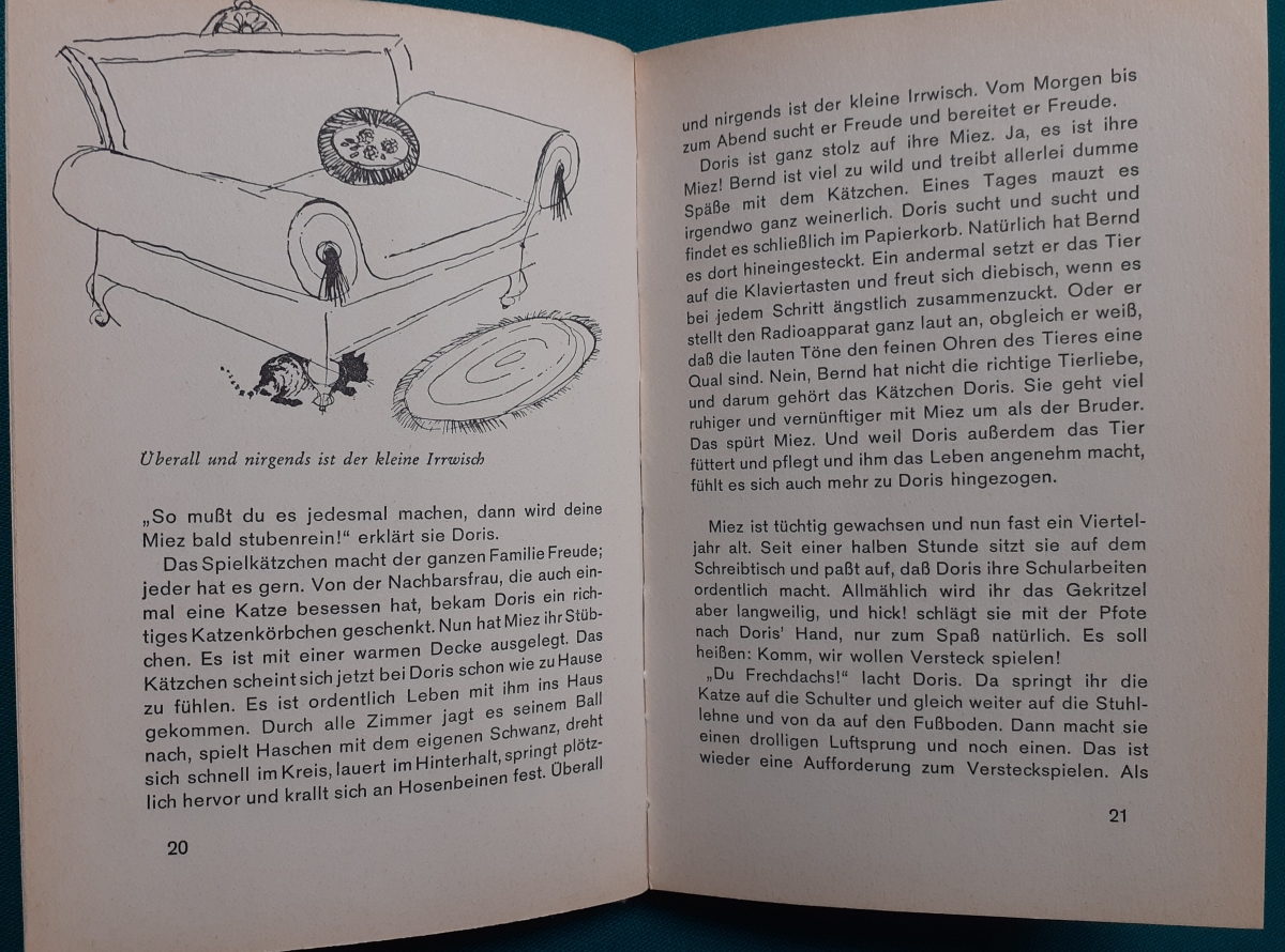 Buches Erich Kloss: Miez und Murr Illustrationen von Binette Schroeder, Ausgabe von 1966, 74 Seiten, guter altersgemäßer Zustand Preis: 6 EURO Binette Schroeder (geb. am 5. Dezember 1939 in Hamburg; gest. am 5. Juli 2022 in Gräfelfing) war eine deutsche Grafikerin und Kinderbuchillustratorin. |