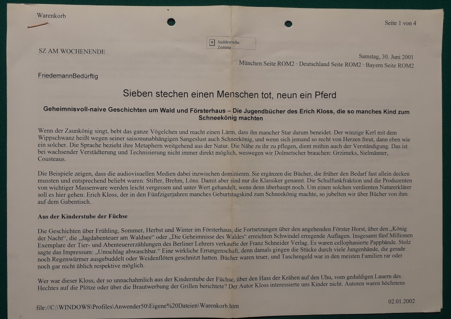 Friedemann Bedürftig: Ausgabe von 2001; Beitrag in der Süddeutschen Zeitung am Wochenende vom 30. Juni 2001; Abdruck des Beitrages auf 4 Seiten, geheftet im Format DIN A4. Zum Inhalt: Preis: 5 EUR |