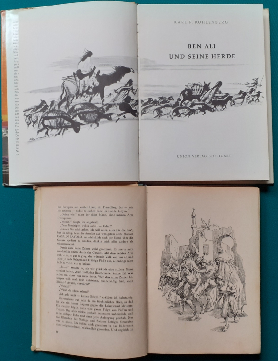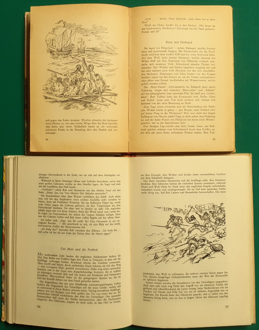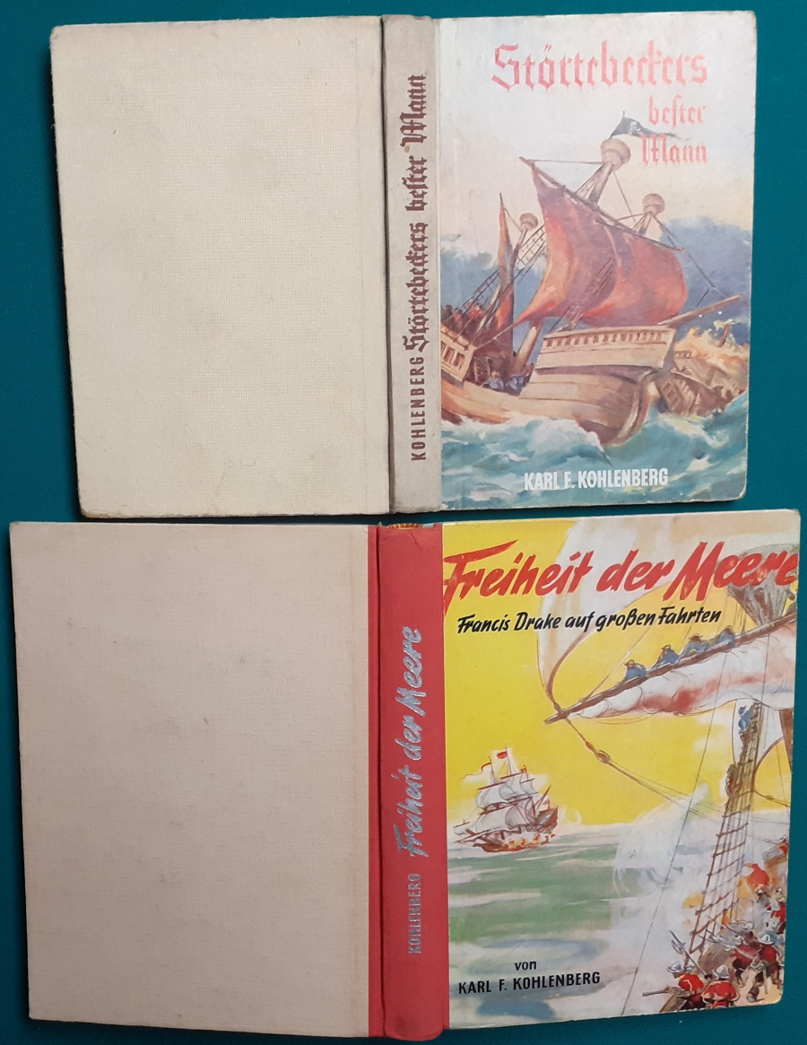 Eine alte Ausgabe von Karl F. Kohlenberg: Störtebeckers bester Mann Hoch Verlag, Düsseldorf, Ausgabe von 1952, 236 Seiten; Illustrationen von Wilhelm Kelter; Leinenrücken mit festem Hartpappeinband; an den Buchkanten bestoßen; insgesamt recht guter altersgemäßer Zustand Preis: 7 EUR Eine weitere alte Ausgabe von Karl F. Kohlenberg: Freiheit der Meere Francis Drake auf großen Fahrten Hoch Verlag, Düsseldorf, Ausgabe von 1954, 240 Seiten; Illustrationen von Helmar Becker-Berke; Leinenrücken mit festem Hartpappeinband; etwas an den Buchkanten bestoßen; insgesamt guter altersgemäßer Zustand Preis: 8 EUR |