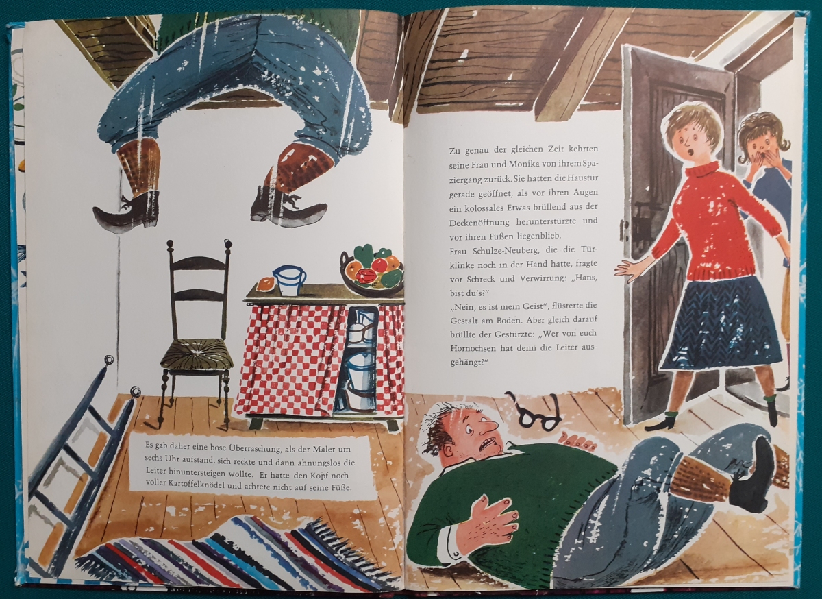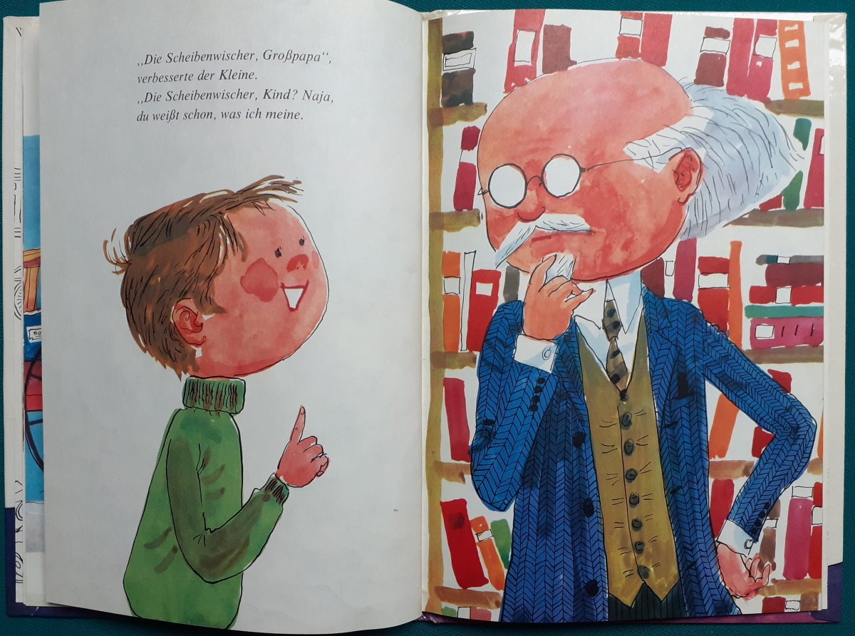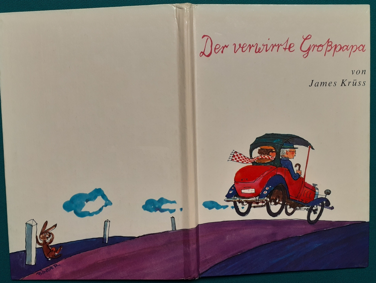 James Krüss: Der verwirrte Großpapa Alfred Holz Verlag, Berlin, Ausgabe von 1974, ca. 40 Seiten - nicht paginiert, rundum lackierter fester Hartpappeinband, Format 24 x 17 cm, Bilder von Eberhard Binder; nur ganz leicht an den Buchkanten bestoßen; insgesamt ist das Buch in altersgemäßem sehr guten Zustand, Preis: 7 EUR Hier zur Illustratoren-Galerie mit typischen Arbeiten von Eberhard Binder |