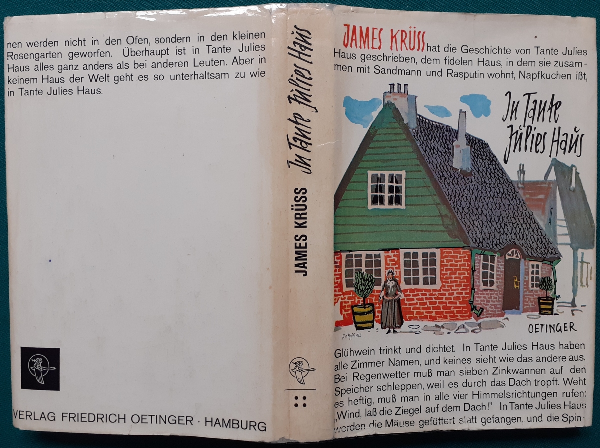 James Krüss: In Tante Julies Haus Illustrationen von Jochen Bartsch; Oetinger Verlag Hamburg, alte Originalausgabe von 1970, 226 Seiten, fester Hardcover Einband mit Hochglanz-Schutzumschlag, 20 x 13 cm, Papier-Schutzumschlag etwas beschädigt; sonst guter altersgemäßer Zustand, Preis 8 EURO Hier zur Illustratoren-Galerie mit typischen Arbeiten von Jochen Bartsch |
