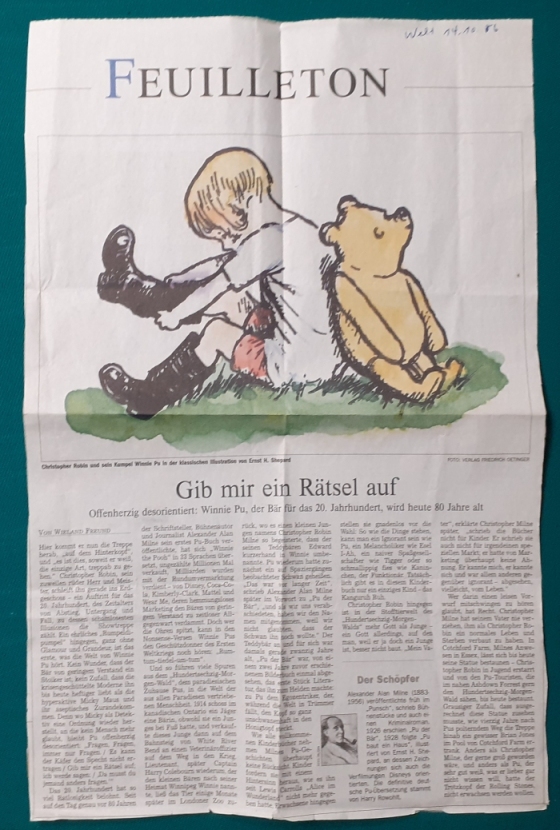Zeitungsartikel zum 80 jährigen Jubiläum von Winnie Pu: Gib mir ein Rätsel auf von Wieland Freund; Artikel im