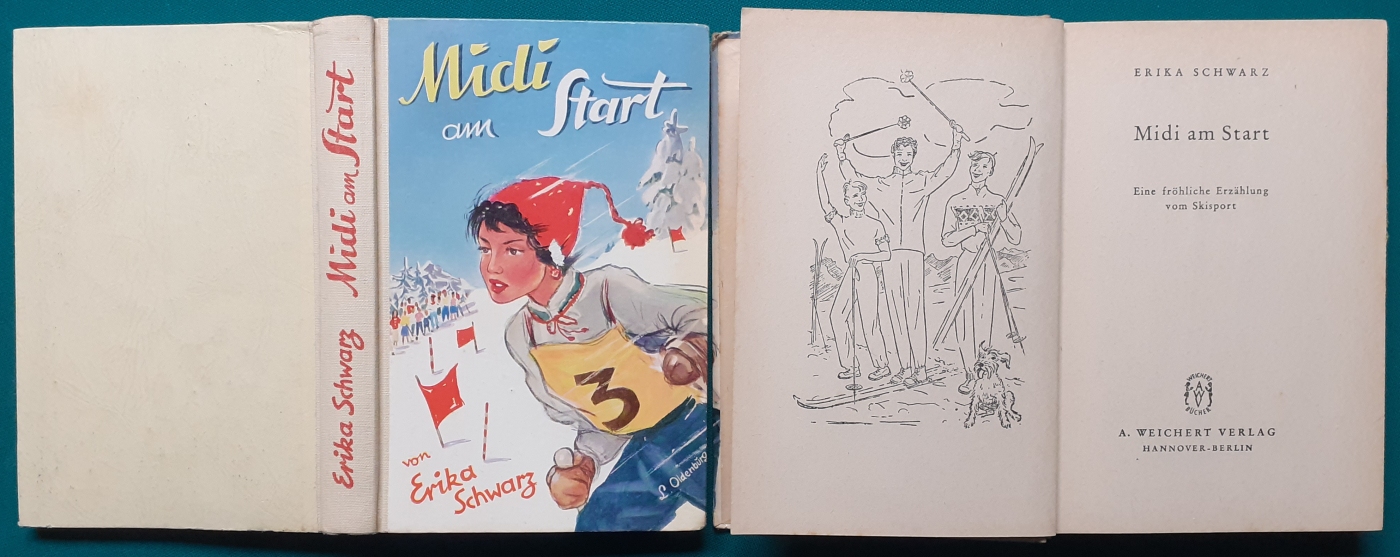 Erika Schwarz: Midi am Start Weichert Verlag Hannover u.a., Erstausgabe von 1955, Illustrationen von Lotte Oldenburg-Wittig und Hilde Wetzel, 128 Seiten, Leinenrücken mit festem lackierten Hartpappeinband, etwas an den Buchkanten bestoßen; Buch in gutem altersgemäßen Zustand, Preis 6 EURO Hier zur Illustratoren-Galerie mit typischen Arbeiten von Lotte Oldenburg-Wittig |