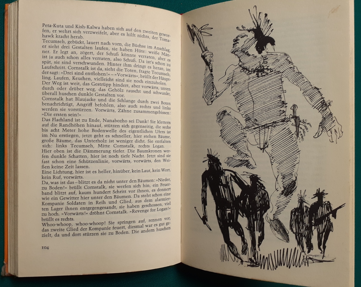 Tecumseh-Abenteuer Es handelt sich jeweils um Voll-Leinen-Einbände mit Schutzumschlag der 1960er und 1970er Jahre mit den Schutzumschlägen von Aiga Rasch Schneller Fuß und Pfeilmädchen Hier zur Illustratoren-Galerie mit typischen Arbeiten von Aiga Rasch |