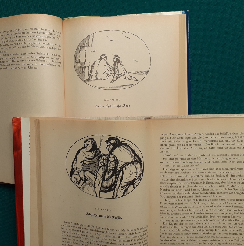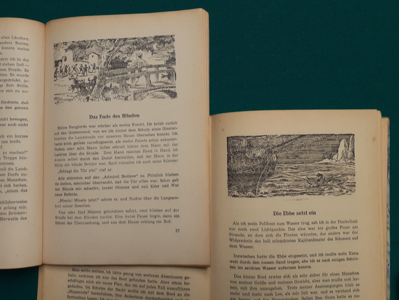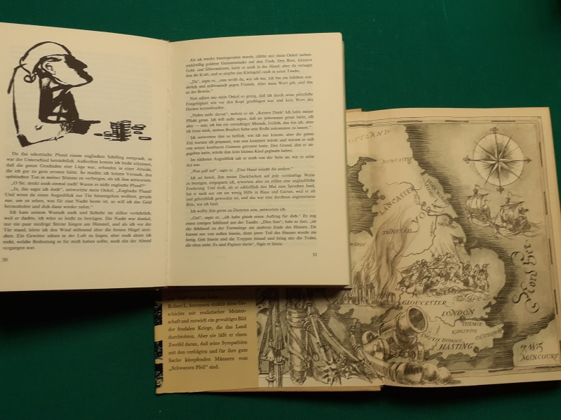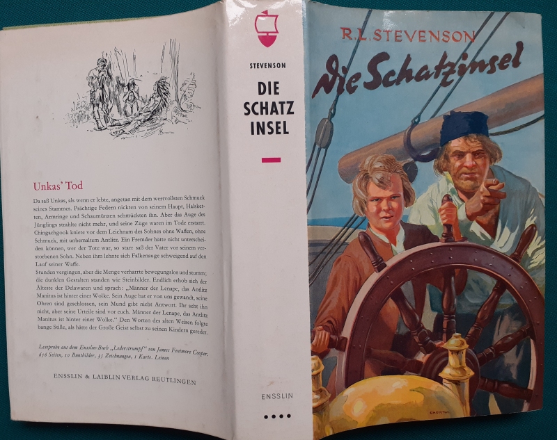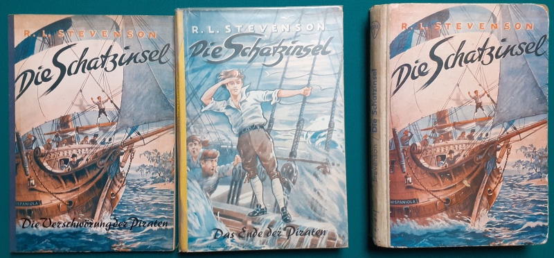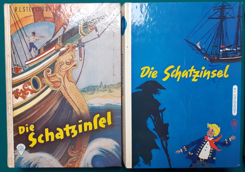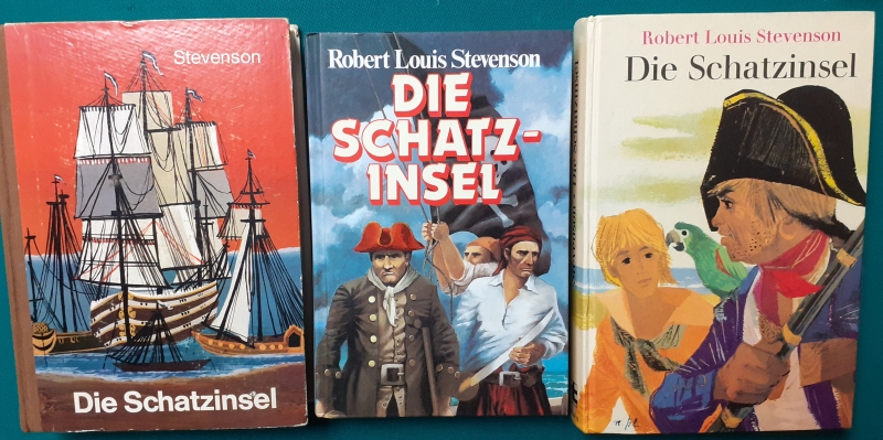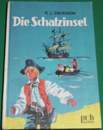 rundum lackierte feste Hartpappeinbände Robert Louis Stevenson: Die Schatzinsel Ausgabe um 1960, in völlig neuer Bearbeitung von John Ala, 174 Seiten, guter altersgemäßer Zustand, Preis: 6 EURO |