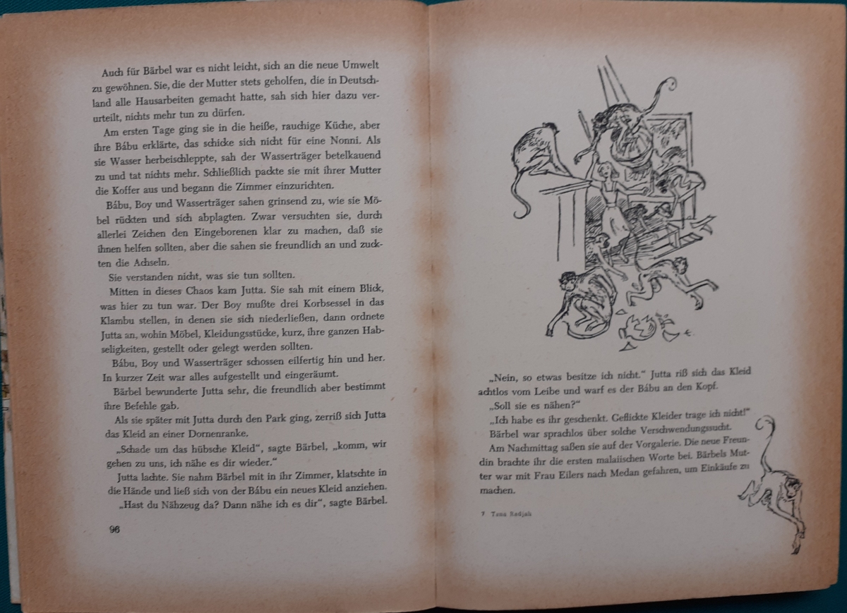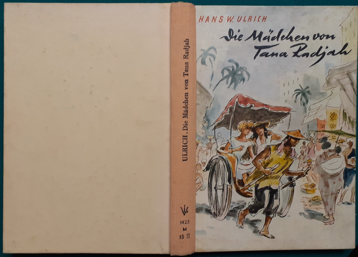 Hans W. Ulrich: Die Mädchen von Tana Radjah Erzählung aus den Tropen Loewes Verlag Ferdinand Carl, Stuttgart, Erstausgabe von 1955, Illustrationen von Karl Eckle, 216 Seiten, Leinenrücken mit Hartpappeinband, Papier stark nachgebräunt an den Blatträndern (siehe Abbildung), Zustand sonst altersgemäß gut, Preis 4 EURO Hier zur Illustratoren-Galerie mit typischen Arbeiten von Karl Eckle |