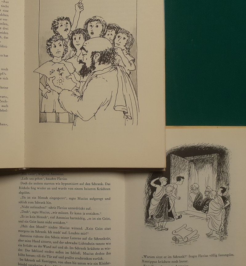 Ein weiterer Klassiker von Telegramm aus Liliput Illustrationen von Regine Ophuls-Ackermann, Blanvalet Berlin, Erstausgabe von 1958, 196 Seiten, Leinenrücken mit glanzlackiertem festen Hartpappeinband, etwas an den Buchkanten bestoßen; insgesamt recht gepflegt und altersgemäßer guter Zustand, Preis: 13 EUR Hier zur Illustratoren-Galerie mit typischen Arbeiten von Regina Ophuls-Ackermann |
