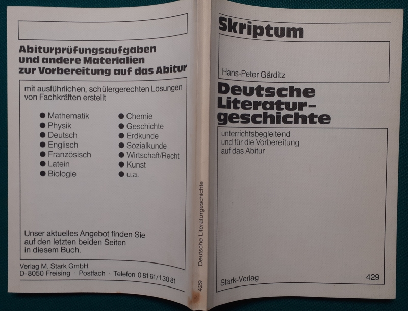 Literaturgeschichte Stark Verlag; von Hans-Peter Gärditz; Ausgabe von 1986, 170 Seiten; Taschenbuch ; guter altersgemäßer Zustand Zum Inhalt (auszugsweise): Preis: 5 EUR |