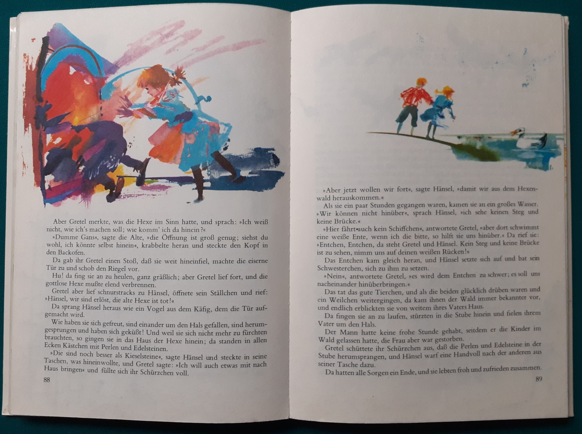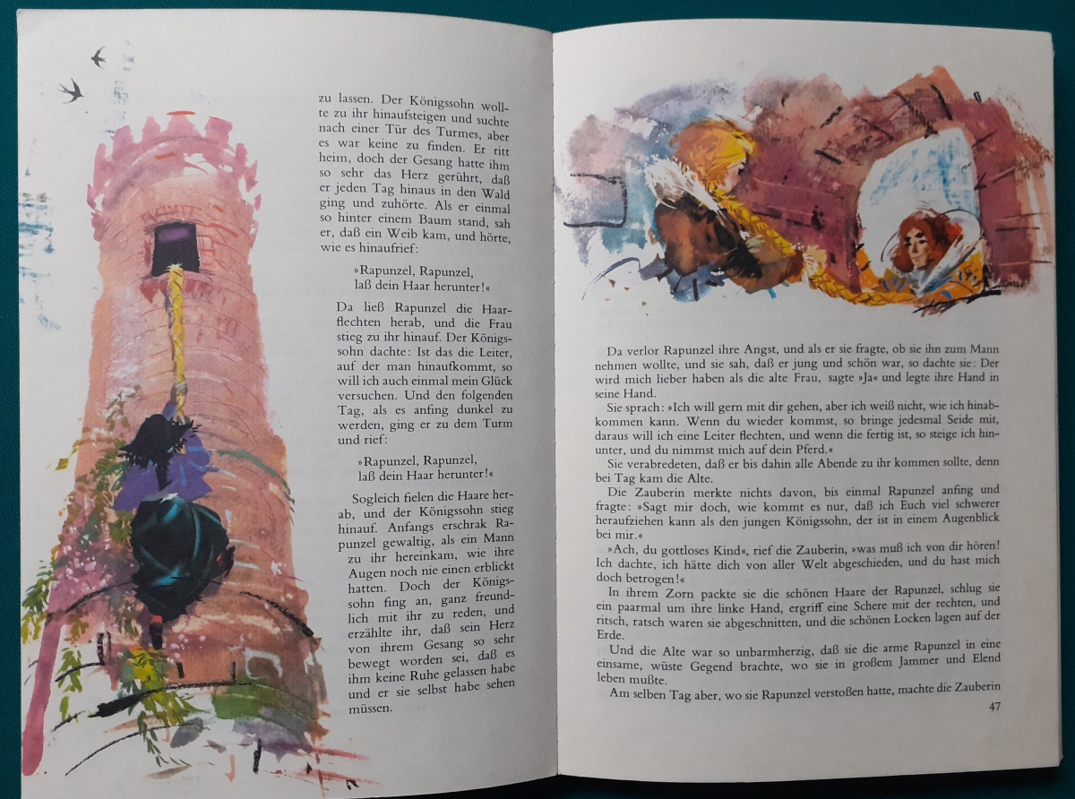 Brüder Grimm: Kinderbuchverlag, Berlin; Ausgabe von 1989, 104 Seiten in festem rundum lackierten Hartpappeinband; Maxi-Format 25 x 17 cm; schöne farbige Illustrationen von Klaus Müller; sehr guter und gepflegter altersgemäßer Zustand Preis: 7 EURO Hier zur Illustratoren-Galerie mit typischen Arbeiten von Klaus Müller |