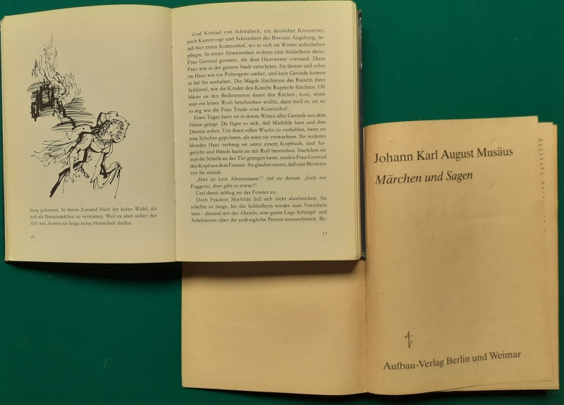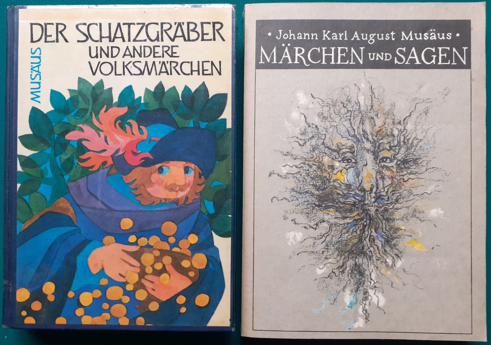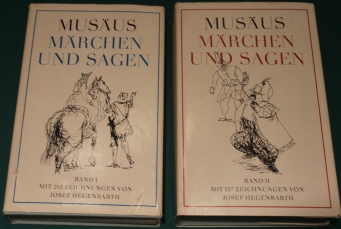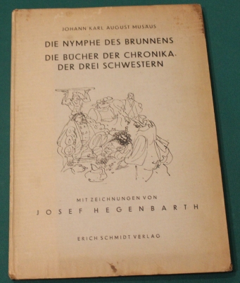 Eine neuere Ausgabe: Johann Karl August Musäus: Volksmärchen der Deutschen Büchergilde Gutenberg; Frankfurt/M. u.a., Ausgabe von 1965, 522 Seiten, mit Zeichnungen von Emil Zbinden; Voll Leinen Einband mit Schutzumschlag; hochwertige Verarbeitung; Papier-Schutzumschlag leicht beschädigt; insgesamt sehr guter altersgemäßen Zustand,