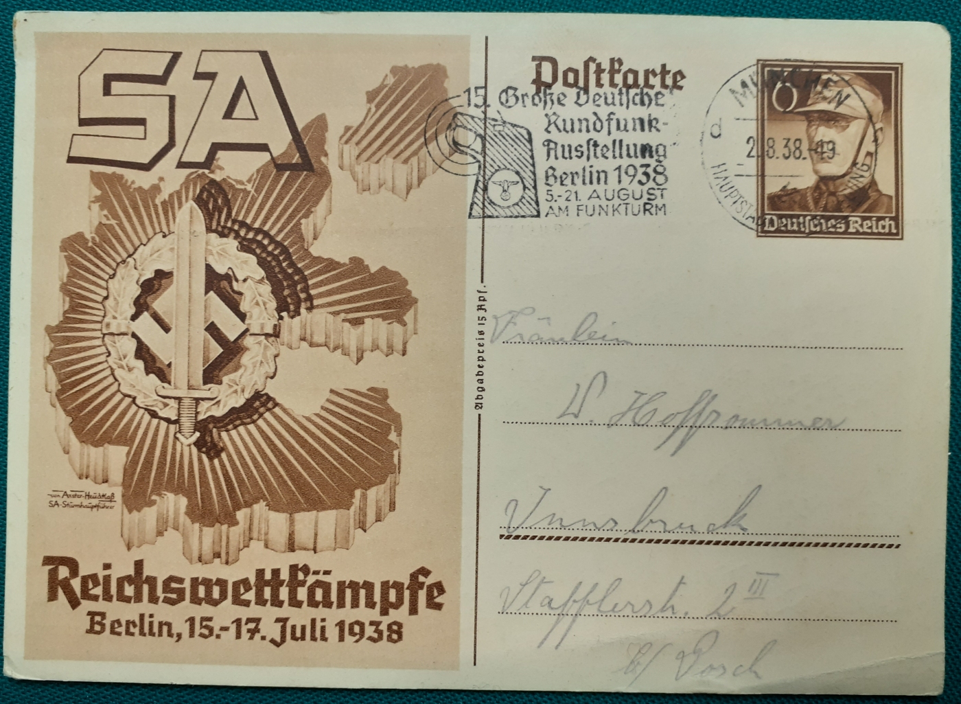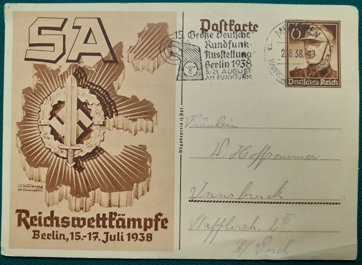 Vordruckpostkarte mit 6 Rpf.: gelaufen am 2.8.1938 von München nach Innsbruck; sehr schönen Rundstempel und Sonderstempel zur Rundfunkausstellung Berlin im August 1938; Rückseite sauber eng eschrieben; Karte gutem altersgemäßen Zustand Preis: 4 EURO |