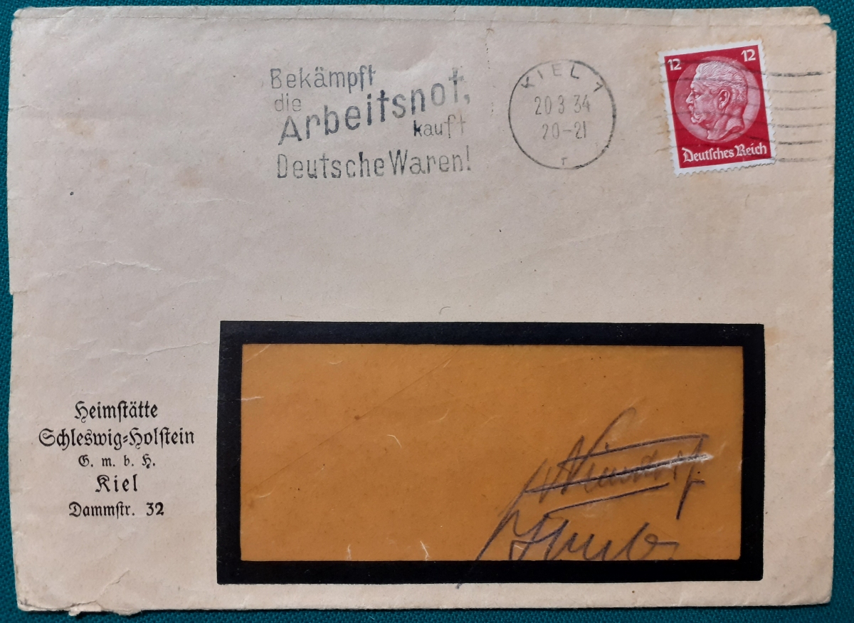 kauft Deutsche Waren!" Briefmarke 12 Rpf. Hindenburg; schöner Rundstempel in Kiel am 20.3.1934;in recht gutem altersgemäßen Zustand Preis: 2 EURO |