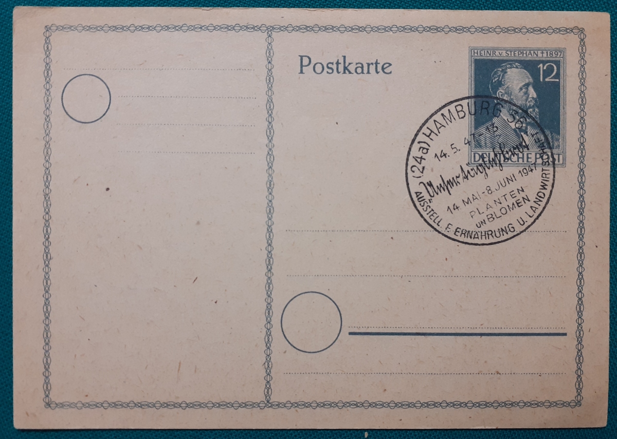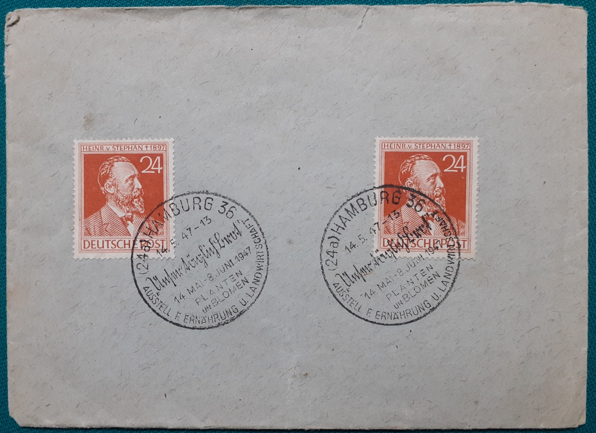 "Unser täglich Brot" Umschlag mit 2 aufgeklebten Marken "Heinrich von Stephan, 24 Pf." und zwei Sonderstempeln in recht gutem altersgemäßen Zustand Preis: 4 EURO |