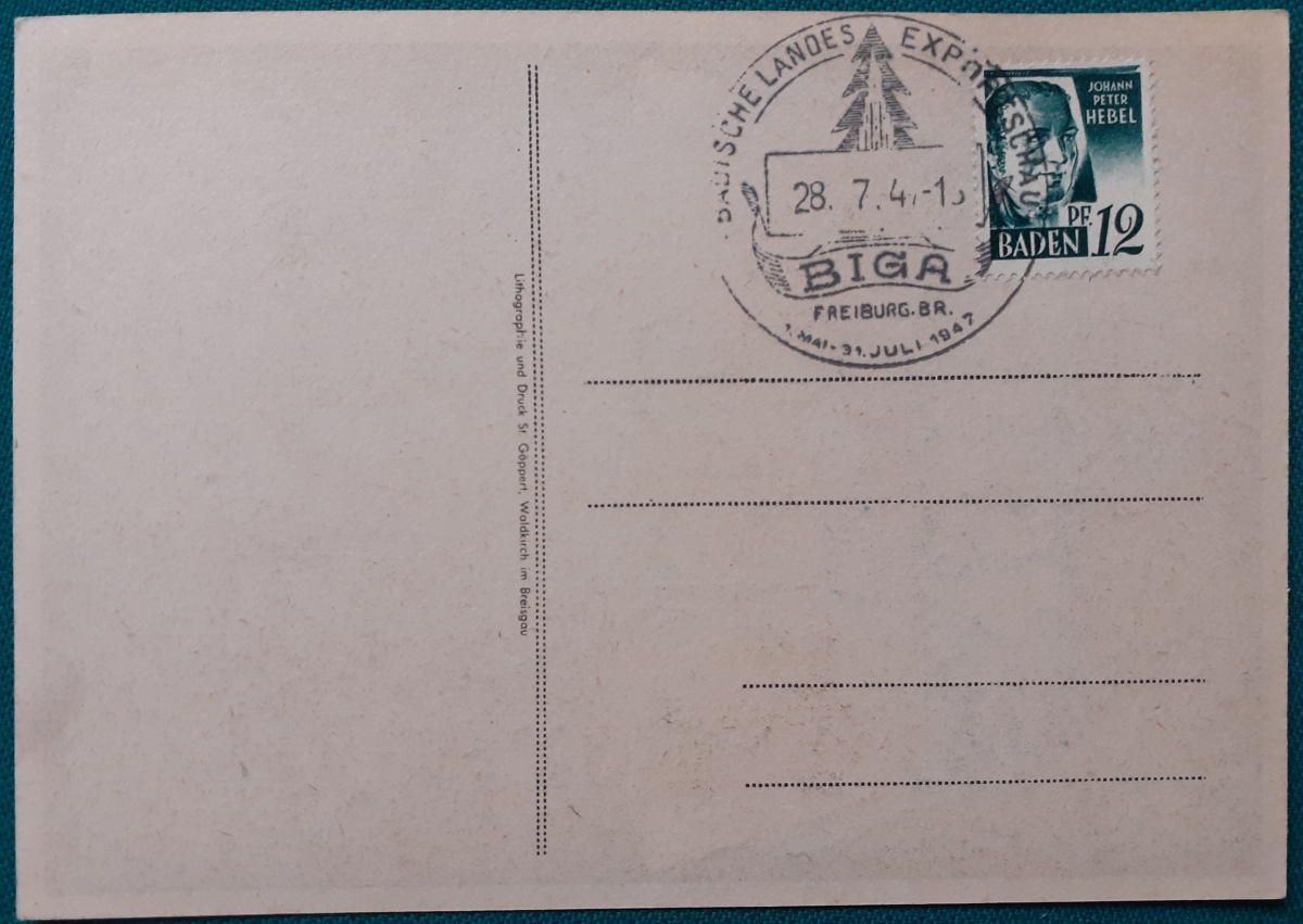 "BIGA" Karte mit einer aufgeklebten Marke "Johann Peter Hebel, 12 Pf" und Sonderstempel in recht gutem altersgemäßen Zustand Preis: 2 EURO |