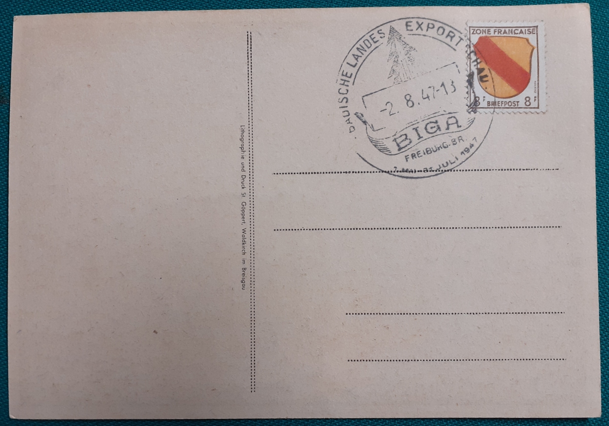 "BIGA" Karte mit einer aufgeklebten Marke "Zone Francaise 8 Pf" und Sonderstempel in recht gutem altersgemäßen Zustand Preis: 2 EURO |