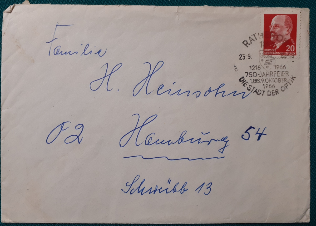 "750-Jahrfeier der Stadt Rathenow - Briefumschlag mit Walter Ulbricht 20 Pf. gelaufen von Rathenow nach Hamburg am 23.9.1966; sehr schöner Sonderstempel in recht gutem altersgemäßen Zustand Preis: 2 EURO |