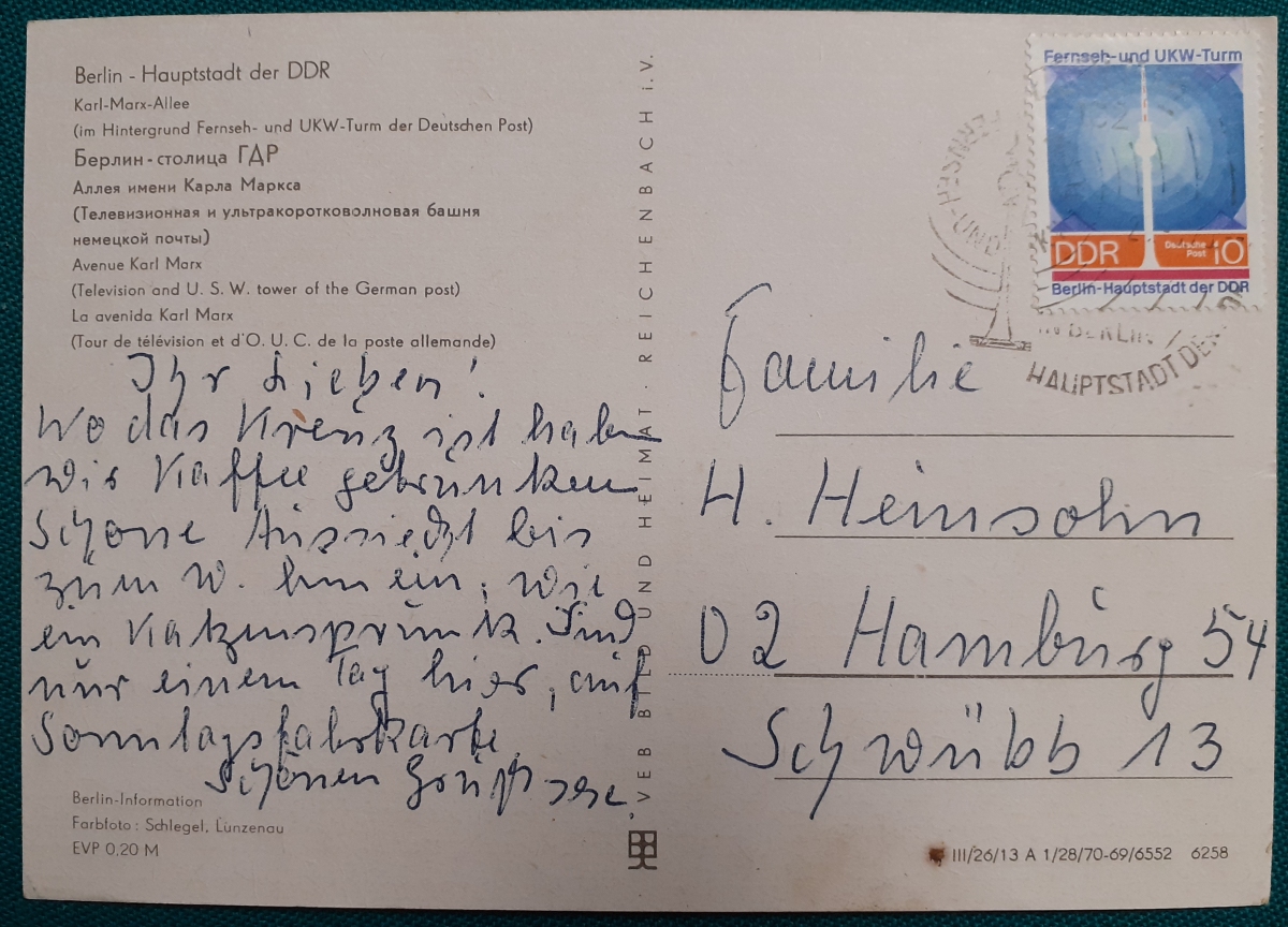 Datiert um 1969: "Fernseh- und UKW-Turm in Berlin" Ansichtskarte mit der Sondermarke "Fernseh- und UKW-Turm, 10 Pf." gelaufen von Berlin nach Hamburg um 1969 (Datum auf dem Rundstempel unleserlich); schöner Sonderstempel in recht gutem altersgemäßen Zustand Preis: 3 EURO |
