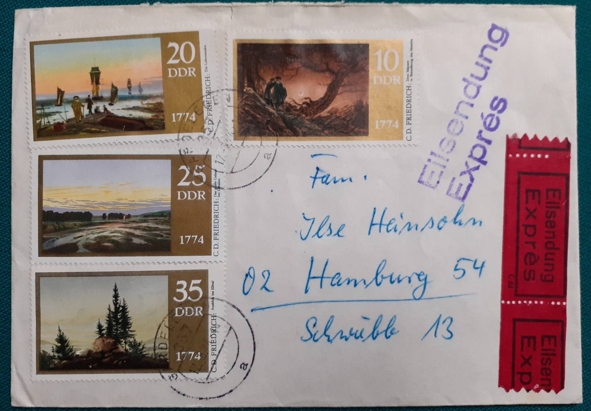 Kompletter DDR-Briefmarkensatz Umschlag als Eilsendung frankiert mit den 4 Werten des oben genannten Satzes; gelaufen am 12.6.1974 von Jävenitz (Kreis Gardelegen) nach Hamburg; Umschlag in recht gutem altersgemäßen Zustand Preis: 4 EURO |