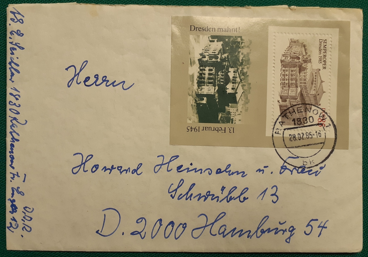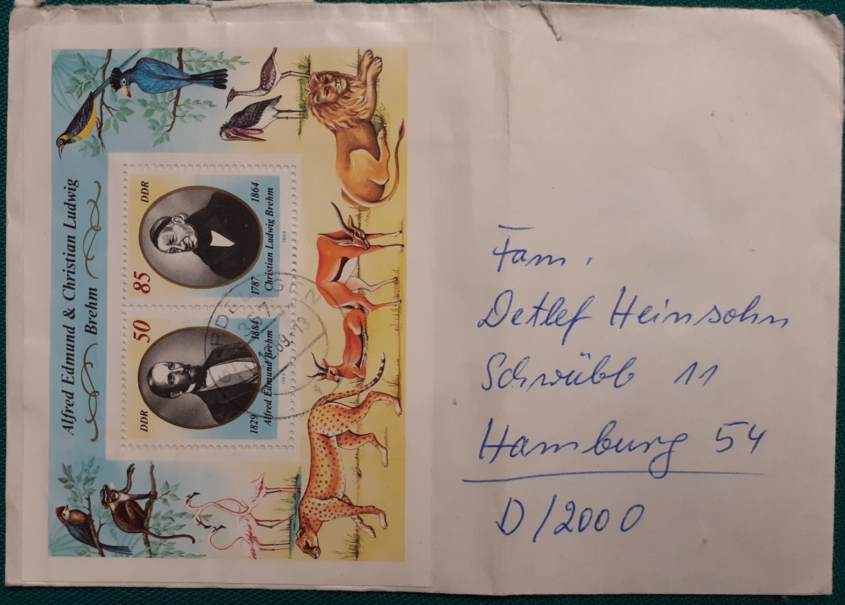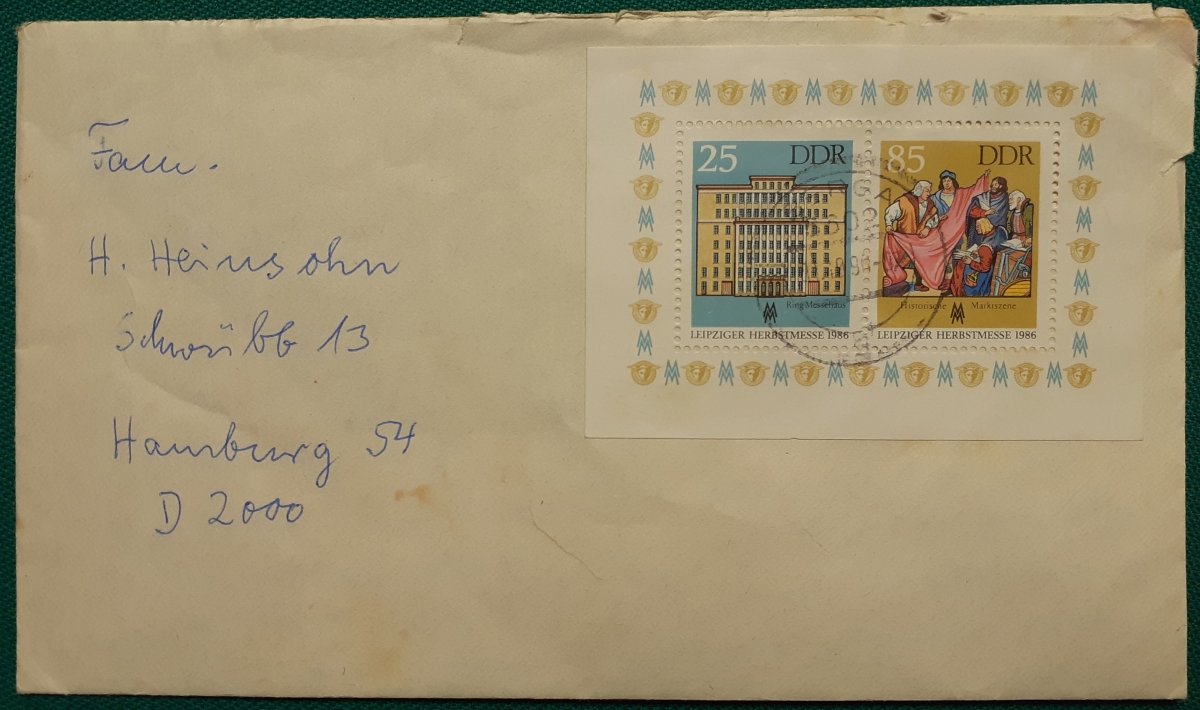 Block Umschlag mit den beiden Werten des oben genannten Blocks; gelaufen am 14.12.1989 von Jävenitz (Kreis Gardelegen) nach Hamburg; Umschlag mit Knick; insgesamt befriedigender altersgemäßer Zustand Preis: 2 EURO |