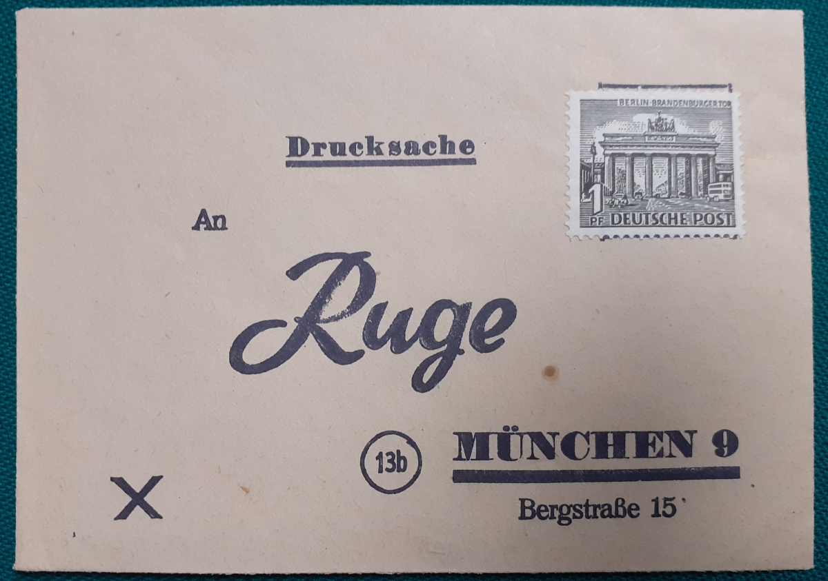 "Rücksendeumschlag als Drucksache um 1947" Frei-Umschlag der Firma Ruge in München; frankiert mit 1 Pf. Brandenburger Tor um 1947; nicht gelaufen; Karte gutem altersgemäßen Zustand Preis: 2 EURO |