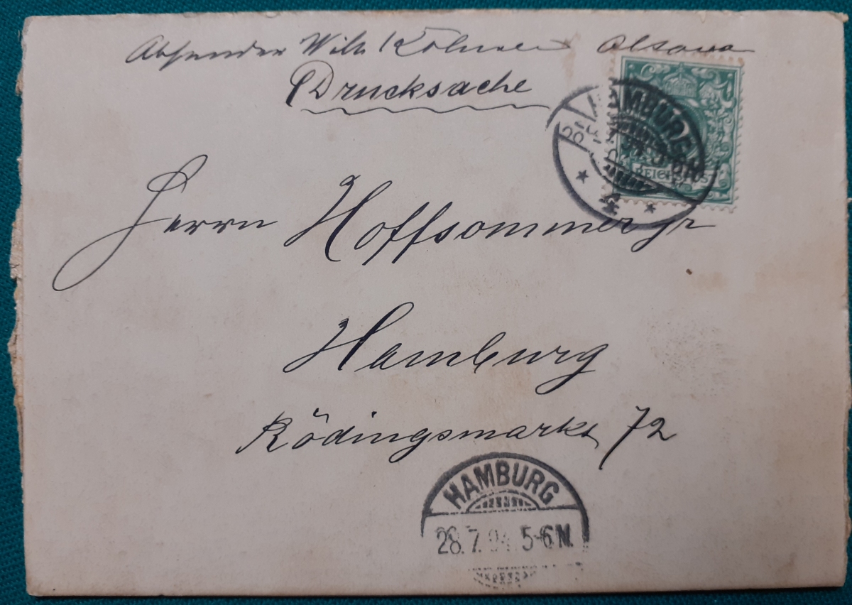"Drucksache von 1894" Briefmarke Deutsches Reich 5 Pf. grün; auf dicker Pappe im Format 12,5 x 9 cm; Schreiben gelaufen am 28.7.1894 als Drucksache von Altona (damals Vorort von Hamburg) nach Hamburg; schöne Rundstempel in recht gutem altersgemäßen Zustand Preis: 3 EURO |