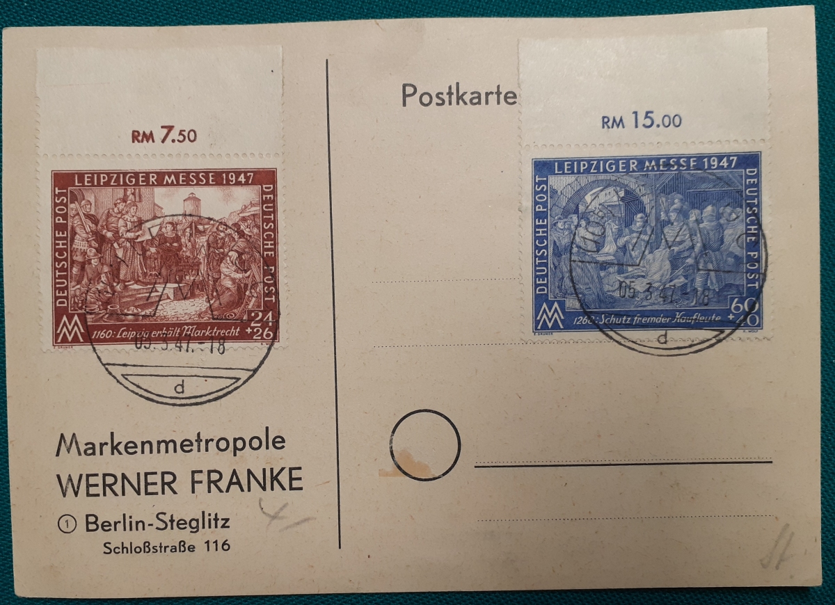 "Leipziger Frühjahrsmesse 1947" Karte mit 2 aufgeklebten Marken "Leipziger Messe 1947", 24+26 sowie 60+40 Rpf - jeweils Bogenrandstücke und schönen Sonderstempeln aus Leipzig vom 5.3.1947 in recht gutem altersgemäßen Zustand Preis: 4 EURO |