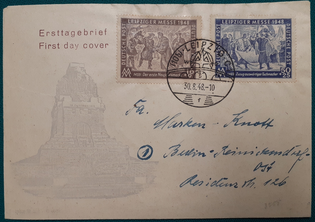 "Leipziger Messe 1948" Umschlag mit 2 aufgeklebten Marken "Leipziger Messe 1948", 16+9 Pf und 50+25 Pf (SBZ) und schönem Sonderstempeln aus Leipzig vom 30.8.1948; der Erstausgabetag der beiden Marken war am 29.8.1948 (deshalb kein Ersttagsbrief); recht guter altersgemäßer Zustand Preis: 4 EURO |