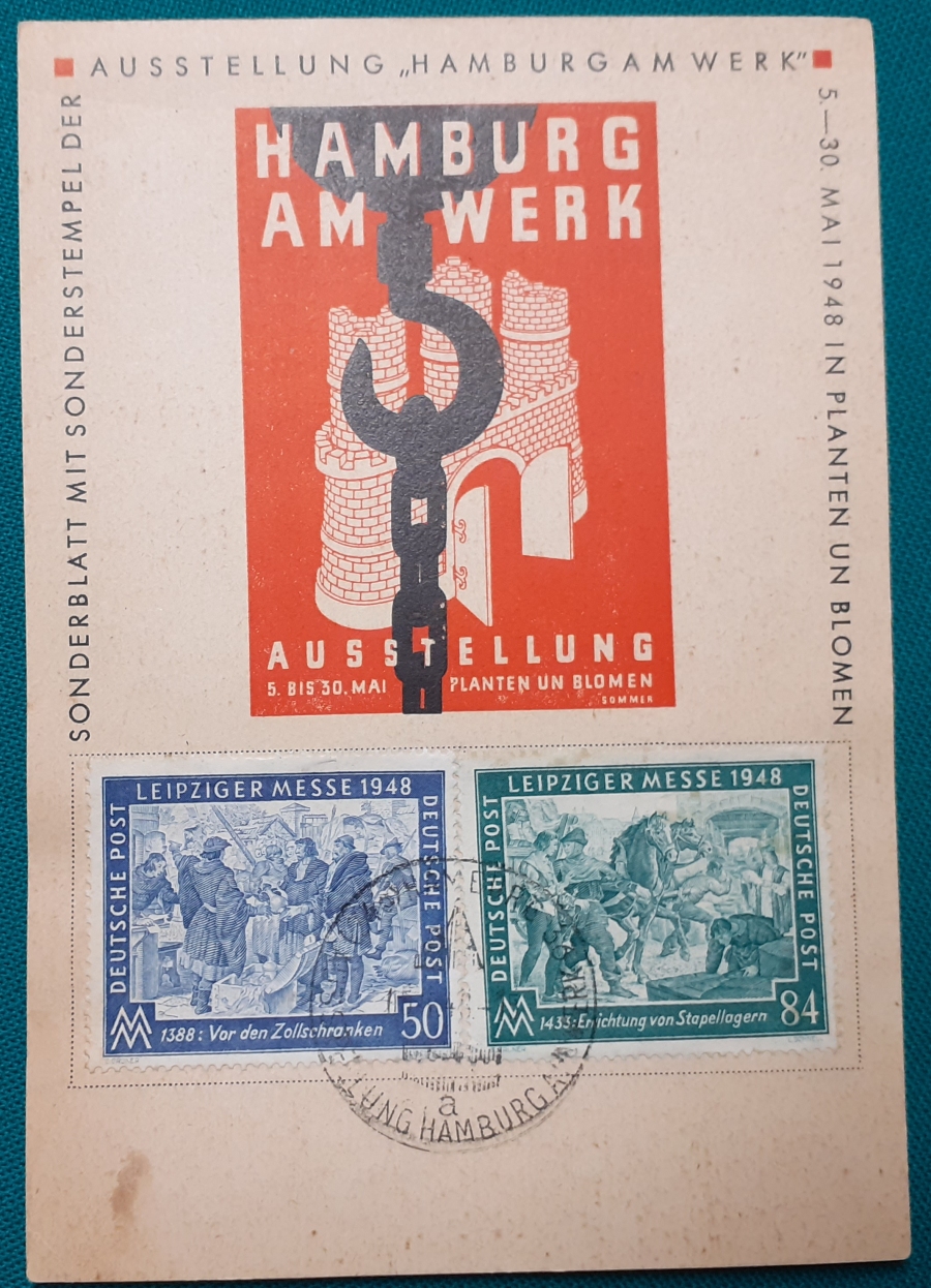 "Hamburg am Werk" Karte mit 2 aufgeklebten Marken "Leipziger Messe 1948, 50 und 84 Pf." und Sonderstempel in recht gutem altersgemäßen Zustand Preis: 4 EURO |