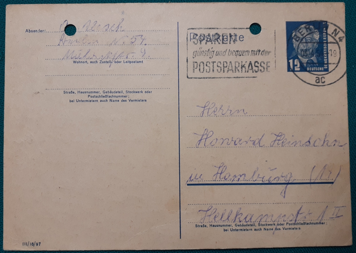 Datiert vom 3.4.1954: "Sparen günstig und bequem mit der Postsparkasse" Postkarte mit aufgedruckter Marke Wilhelm Piek 12 Pf.; gelaufen am 3.4.1954 von Berlin nach Hamburg; Karte oben gelocht; sonst recht guter altersgemäßer Zustand Preis: 2 EURO |