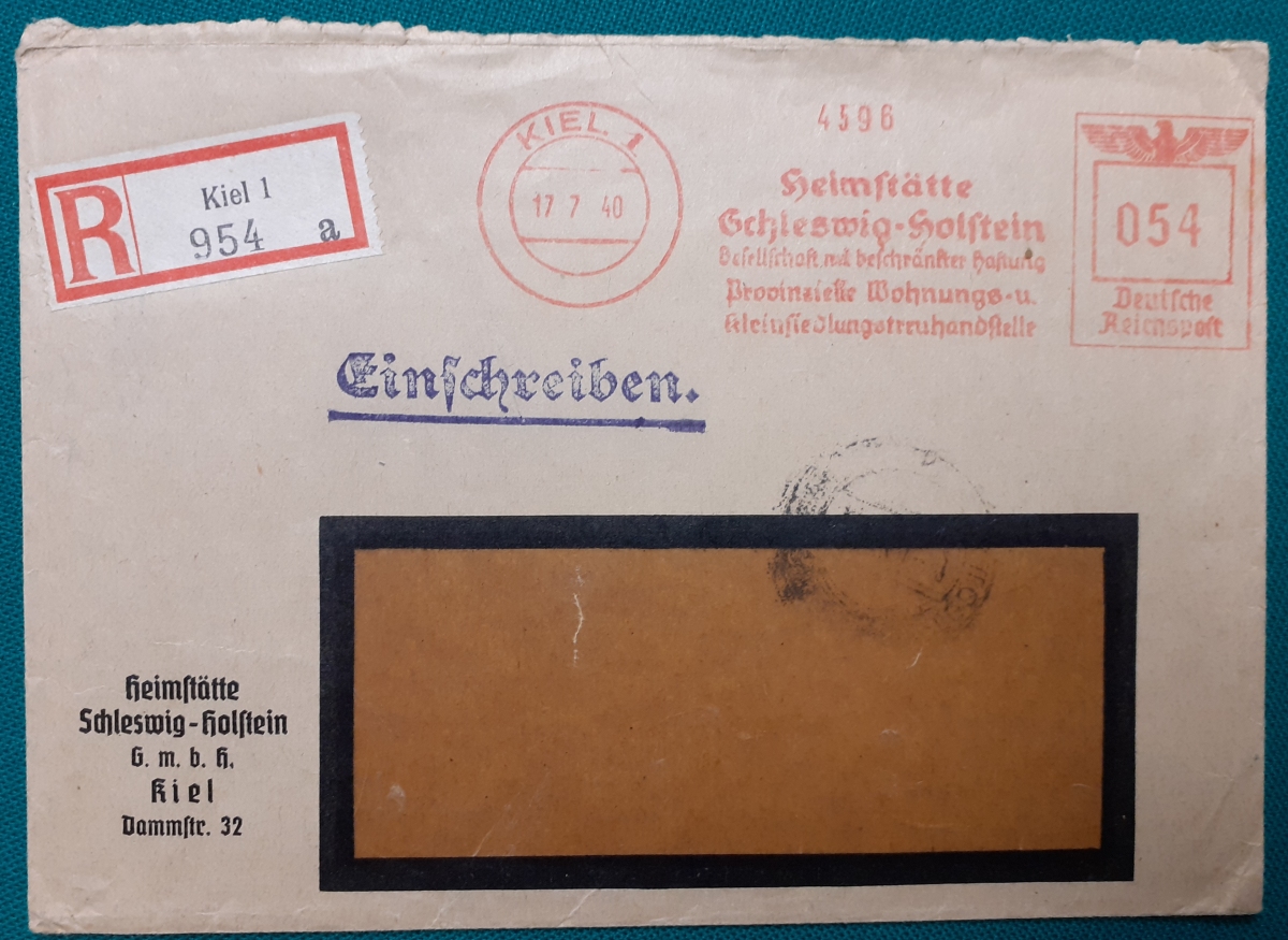 "Einschreibebrief von 1940" mit Freistempler "Heimstätte Schleswig-Holstein und schönem Rundstempel; gelaufen am 17.7.1940 als Einschreiben ab Kiel nach Hamburg-Lokstedt; Umschlag in recht gutem altersgemäßen Zustand Preis: 2 EURO |