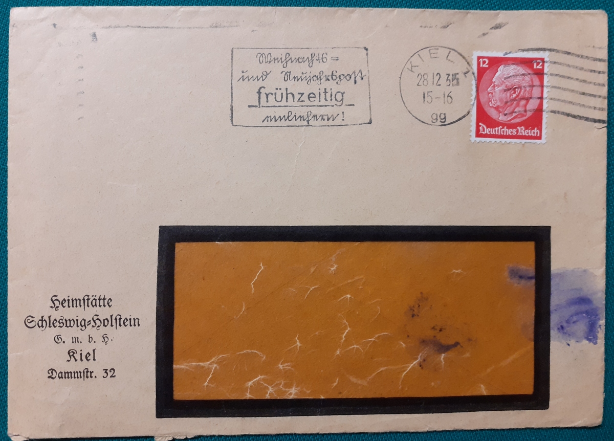 "Weihnachts- und Neujahrspost frühzeitig einliefern!" Briefmarke 12 Rp. Hindenburg; schöner Rundstempel in Kiel am 28.12.1935;in recht gutem altersgemäßen Zustand Preis: 2 EURO |