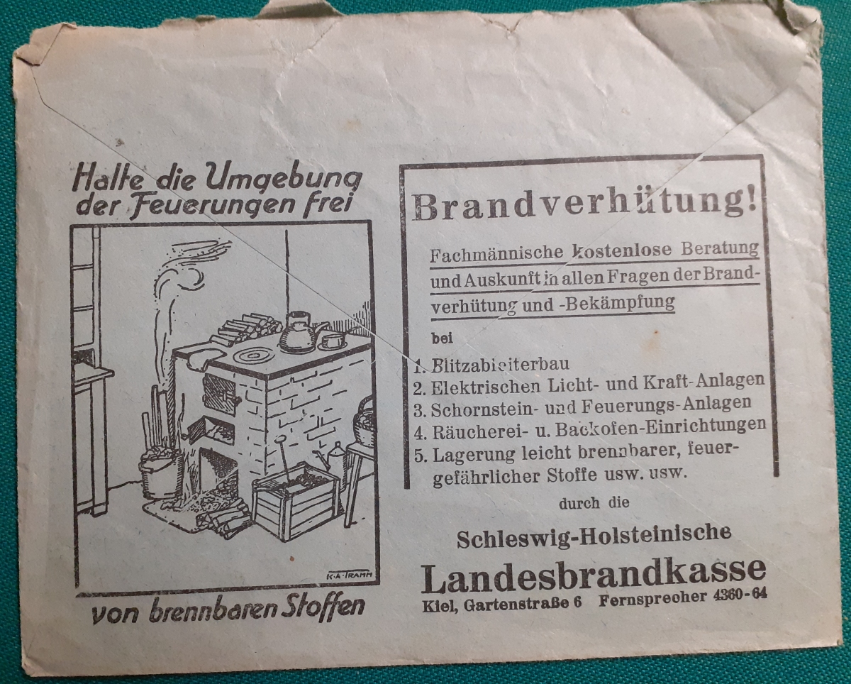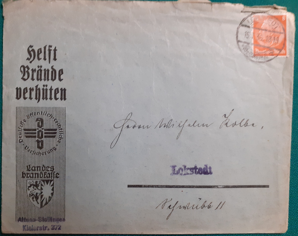 "Briefumschlag von 1936" Briefmarke Deutsches Reich Hindenburg 8 Pf. rot; gelaufen am 15.1.1936 von der von der Landesbrandkasse Altona-Stellingen nach Lokstedt (Kreis Pinneberg) nach Hamburg; Rundstempel; Rückseite mit Infos zur Brandverhütung; Umschlag in recht gutem altersgemäßen Zustand Preis: 3 EURO |
