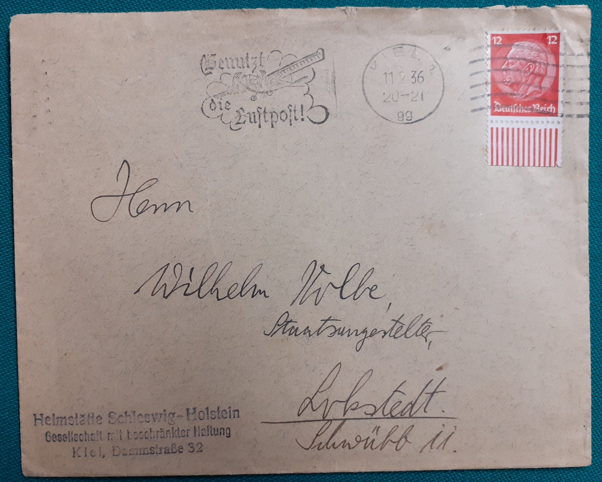 "Benutzt die Luftpost" Briefmarke 12 Rp. Hindenburg; schöner Rundstempel in Kiel am 11.2.1936;in recht gutem altersgemäßen Zustand Preis: 2 EURO |