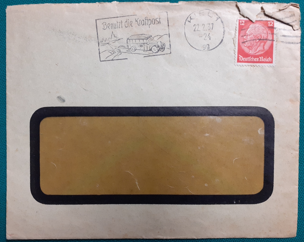 "Benutzt die Kraftpost" Briefmarke 12 Rp. Hindenburg; schöner Rundstempel in Kiel am 22.2.1937;in recht gutem altersgemäßen Zustand Preis: 2 EURO |
