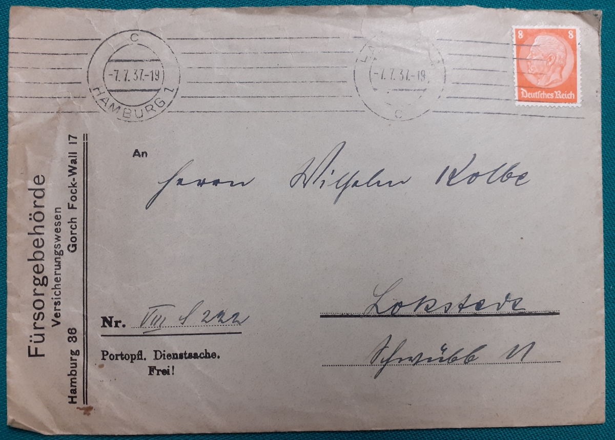 "Briefumschlag von 1937" Briefmarke Deutsches Reich Hindenburg 8 Pf. rot; gelaufen am 7.7.1937 von der von der Fürsorgebehörde Hamburg nach Lokstedt (Kr. Pinneberg); Rundstempel; Umschlag in recht gutem altersgemäßen Zustand Preis: 2 EURO |