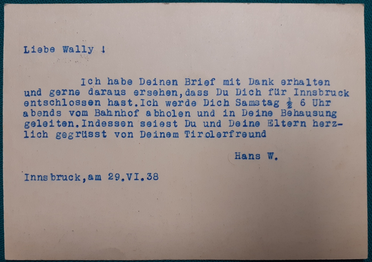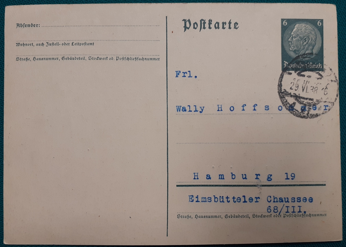 Datiert vom 29.6.1938: Vordruckpostkarte mit 6 Rpf. Hindenburg gelaufen am 29.6.1938 von Innsbruck nach Hamburg; Rundstempel; maschinegeschrieben; Karte gutem altersgemäßen Zustand Preis: 2 EURO |