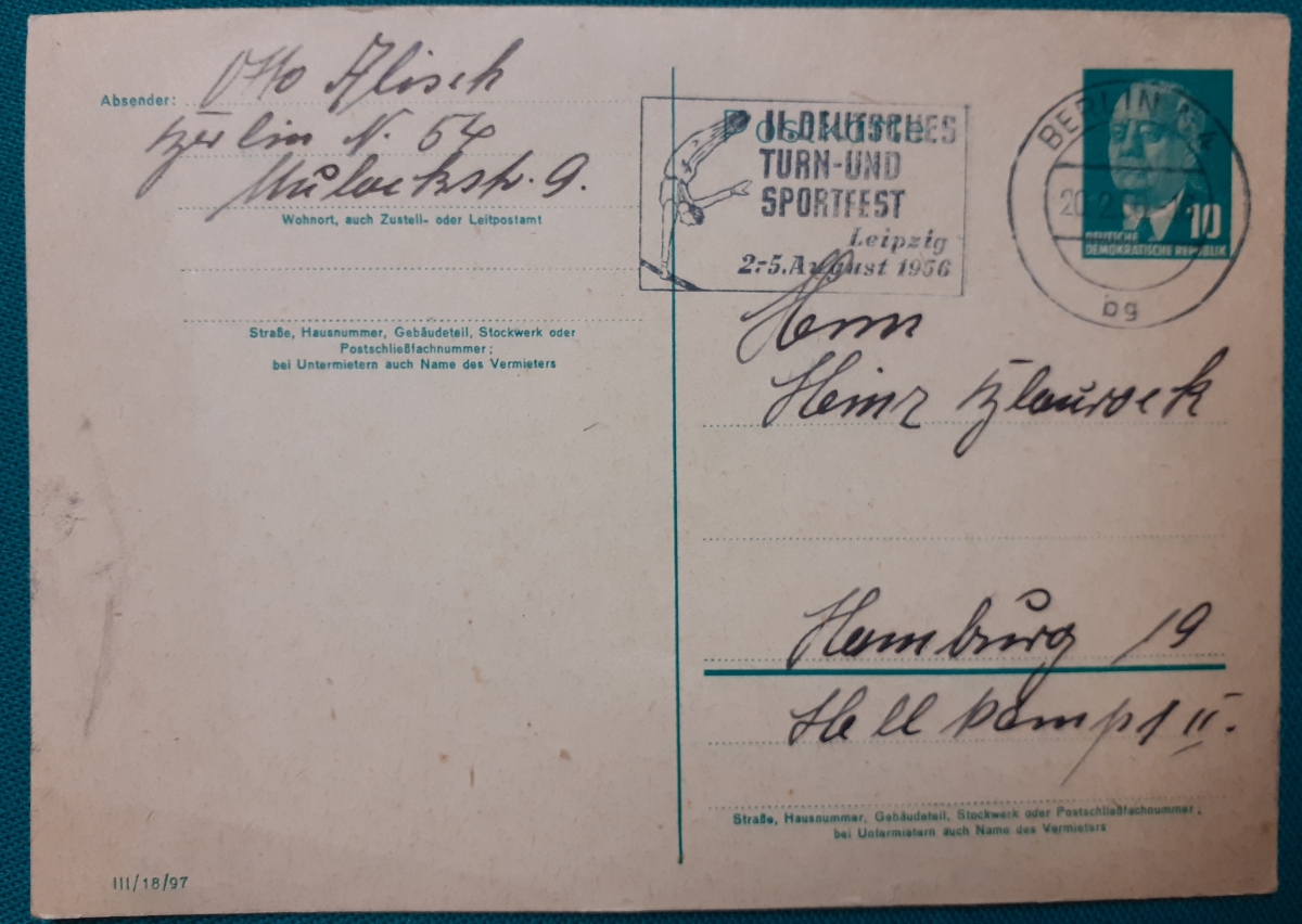 "II. Deutsches Turn- und Sportfest" Vordruck-Postkarte mit aufgedruckter Marke Wilhelm Piek 10 Pf.; gelaufen am 20.2.1956 von Berlin nach Hamburg; guter altersgemäßer Zustand Preis: 2 EURO |